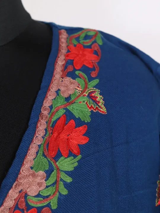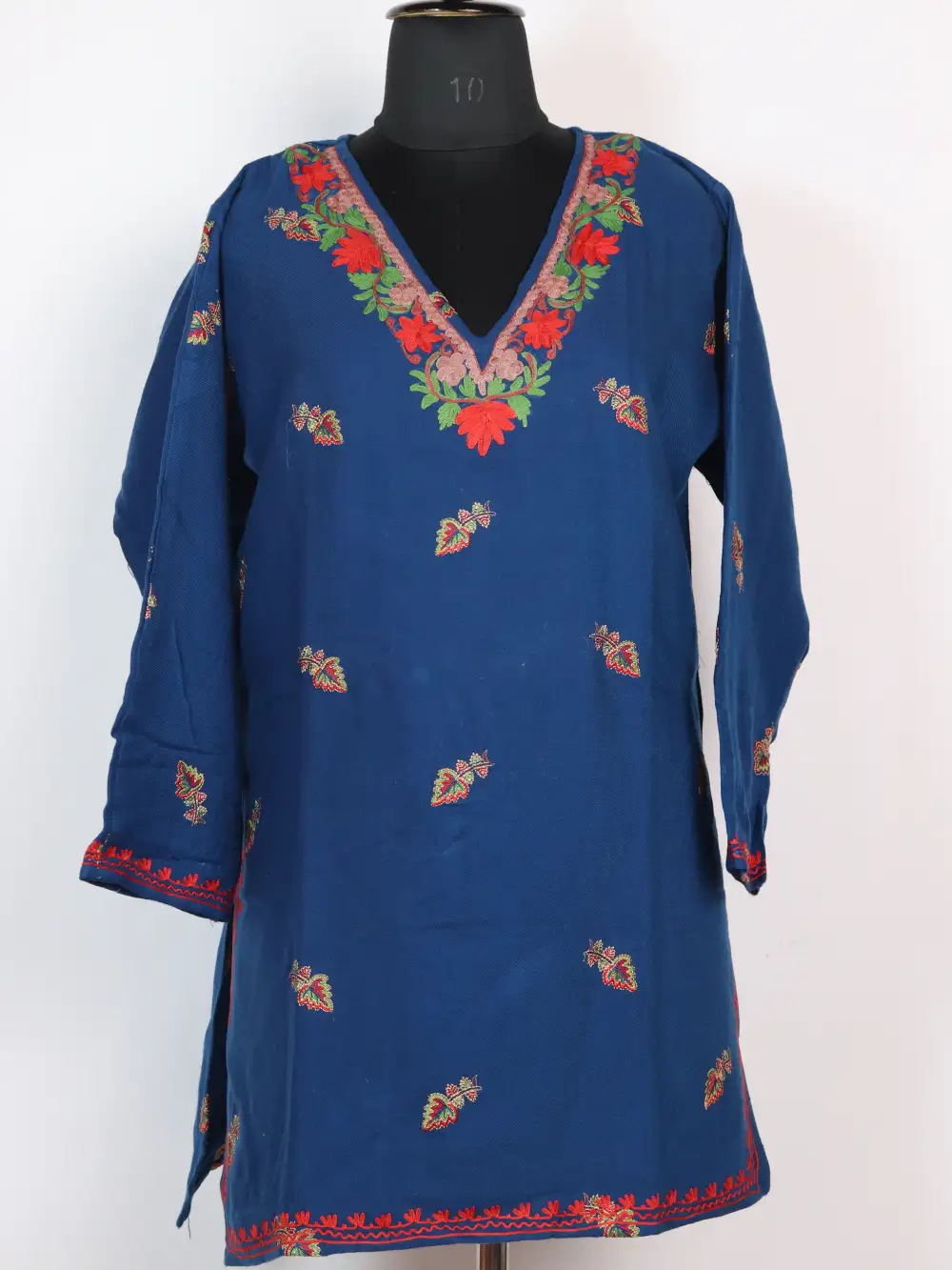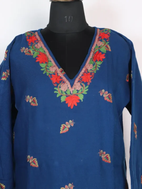 Made from soft cashmilon wool, this royal blue kurti highlights the beauty of embroidery in a simple form. At the neckline, floral motifs have been embroidered with red and green threads, while red-green chinar bootis in sozni work add texture throughout. Warm yet light, it is a versatile choice for winter days. The balance of style and comfort ensures it fits well in both casual and semi-formal settings.