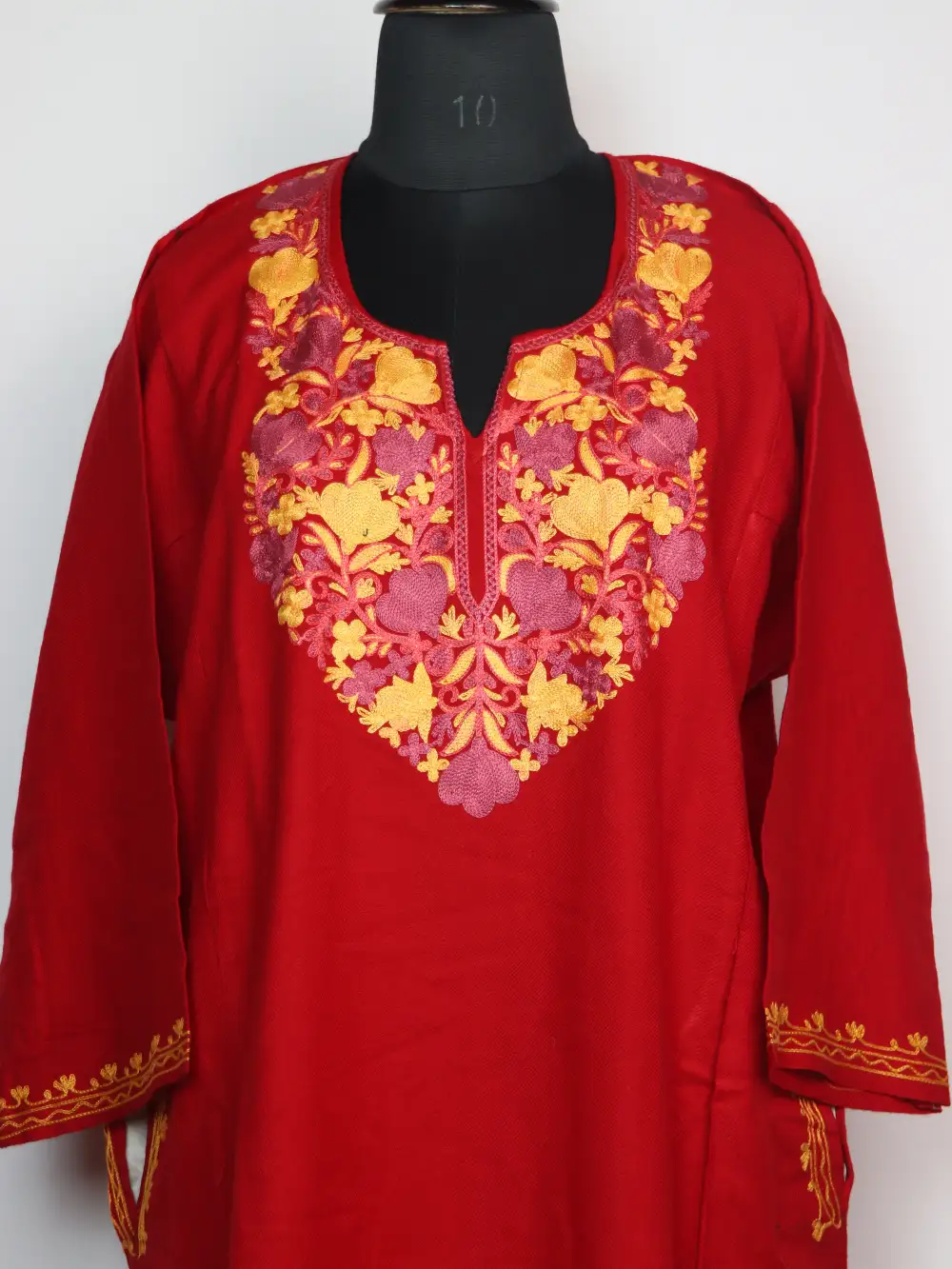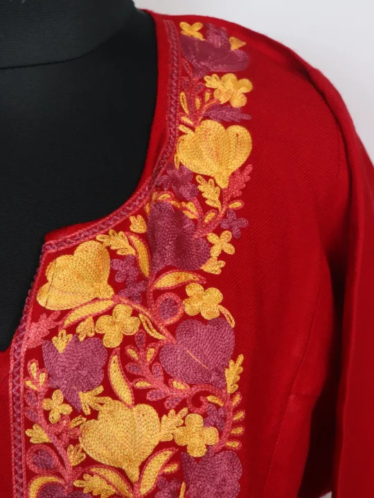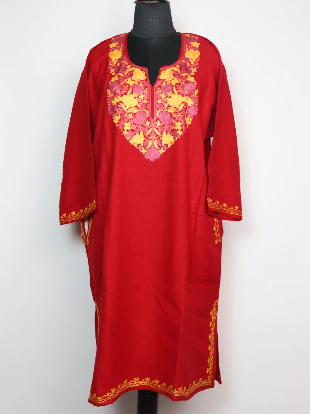A Kashmiri traditional dress pheran in red colour crafted in cashmilon wool and touched with floral aari embroidery around the neckline. Its both-side pockets bring comfort.