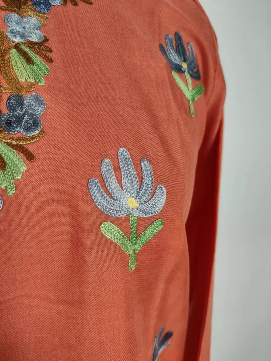 This peach color kurti is 30 inches long and has 40 inches chest size. It has been tailored in Summer cool Cotton and elevated with elegant Aari embroidery. Its floral work has been done in green and blue threads which runs across the neckline and in booti style, that gives this garment a graceful finishing touch. It is soft and breathable, which makes it suitable for warmer days while also staying stylish for semi-formal gatherings. It is a simple yet charming piece for everyday wear.