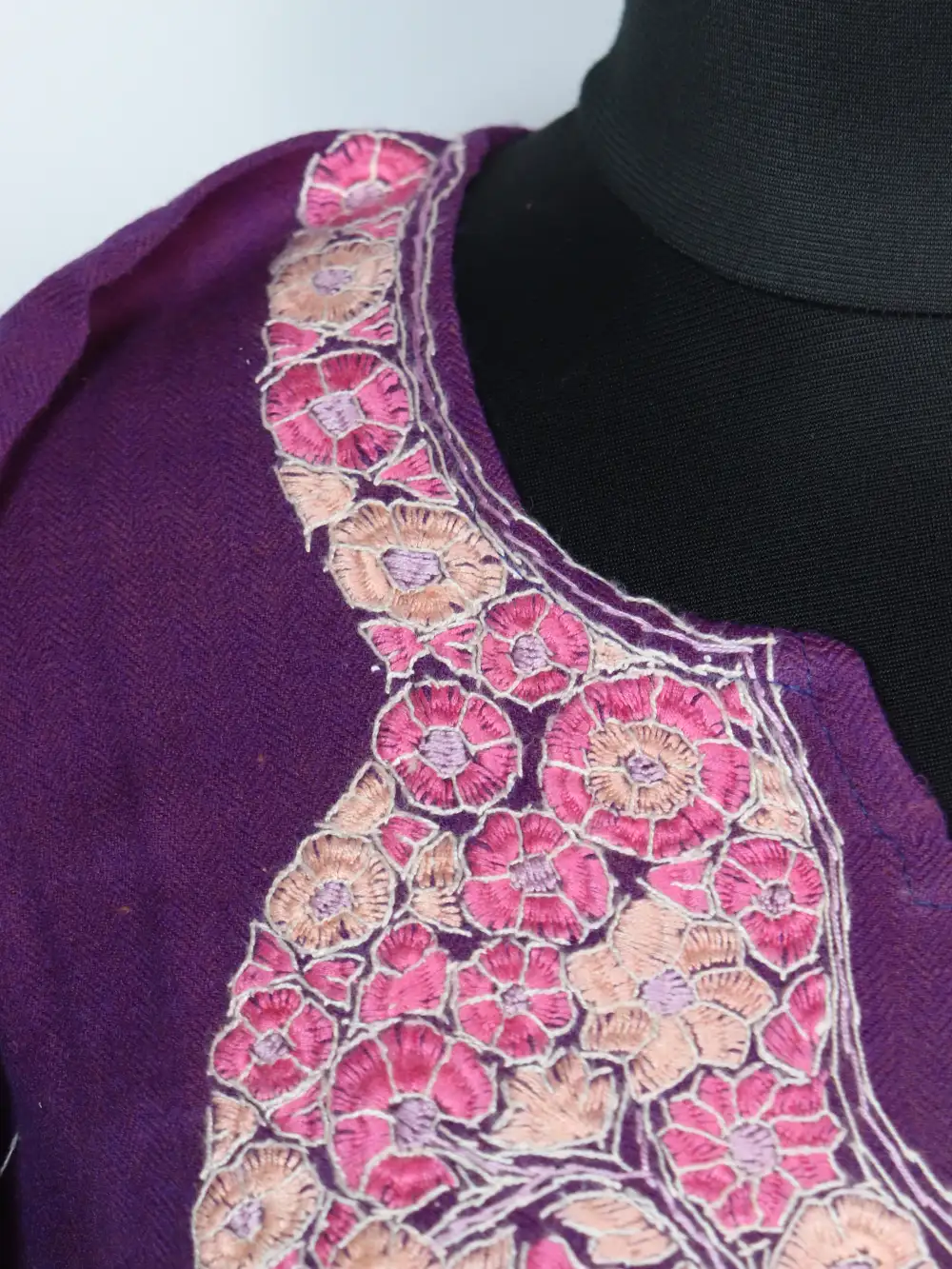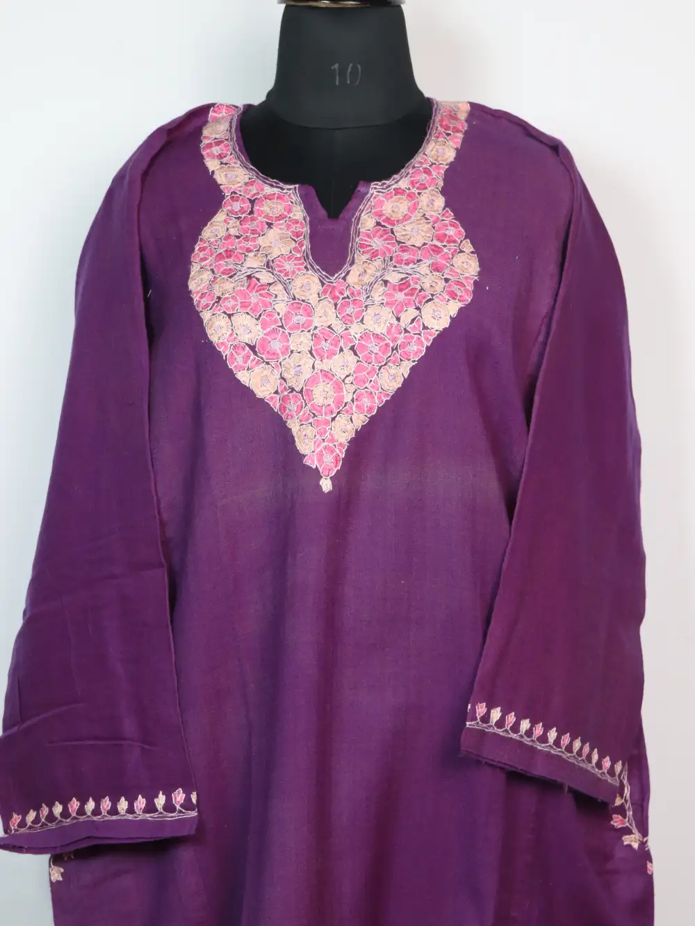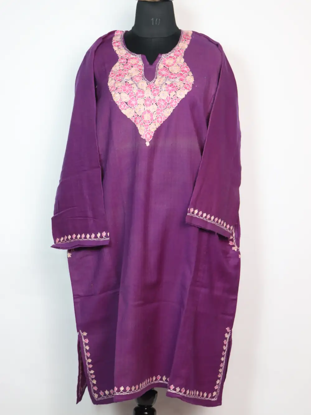 Comfortable in raffal wool, this violet pheran displays delicate paper machie and sozni embroidery at the neckline. It is designed with practical pockets on both sides, this pheran keeps essentials close while projecting soft Kashmiri charm.