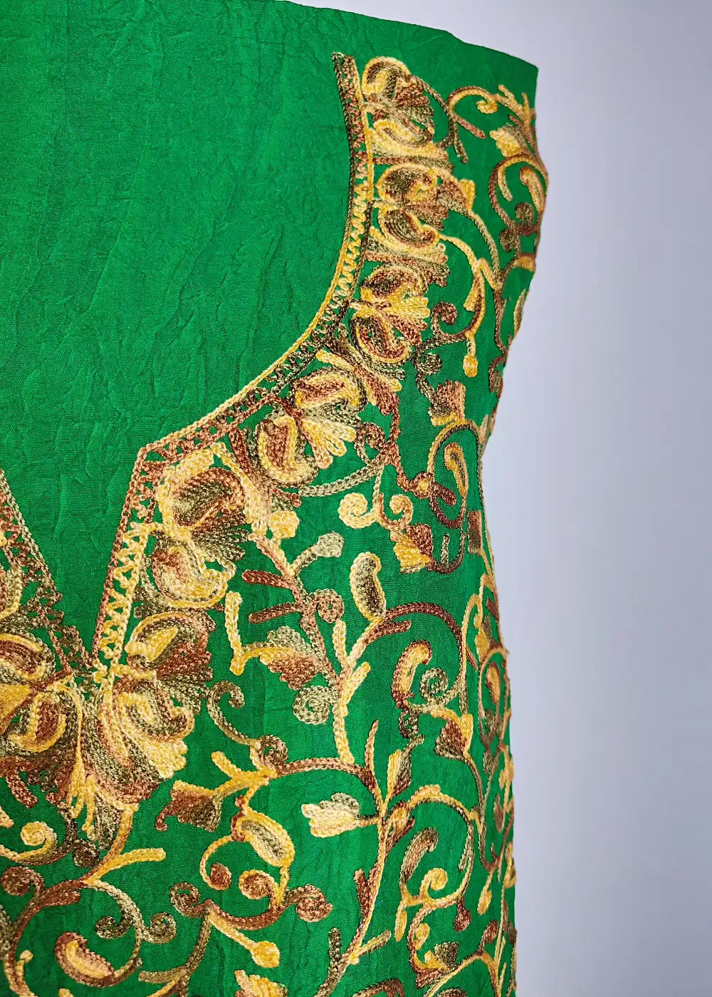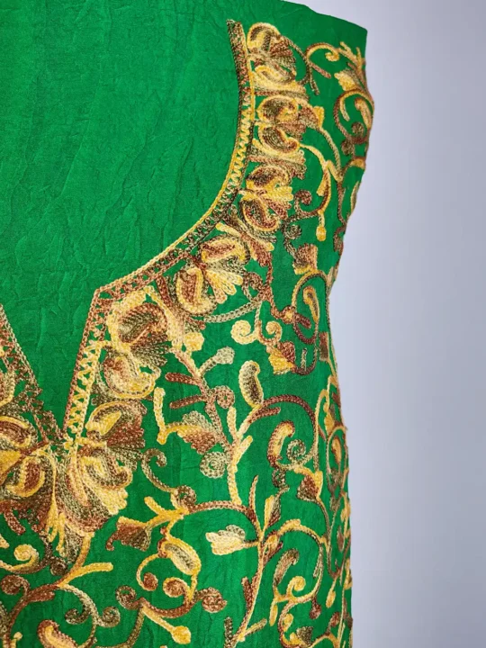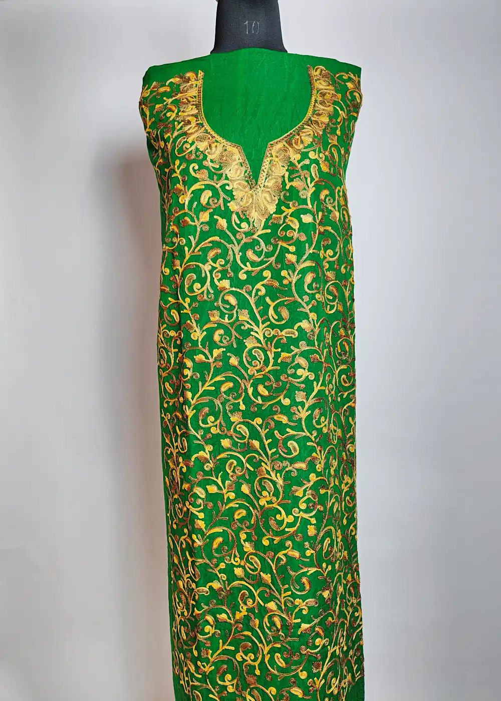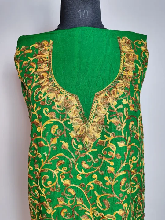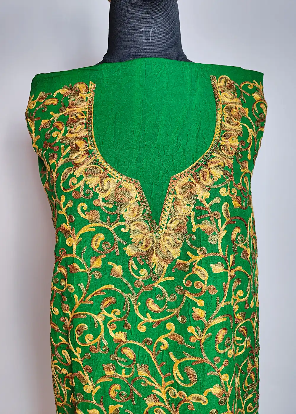 This Green Kashmiri designer suit 2pc crush cotton features badaam jaal spread across the fabric with neat Aari embroidery at the neckline. The cotton feels light and suitable for warm weather. It is offered unstitched so you can stitch it in your preferred fitting.