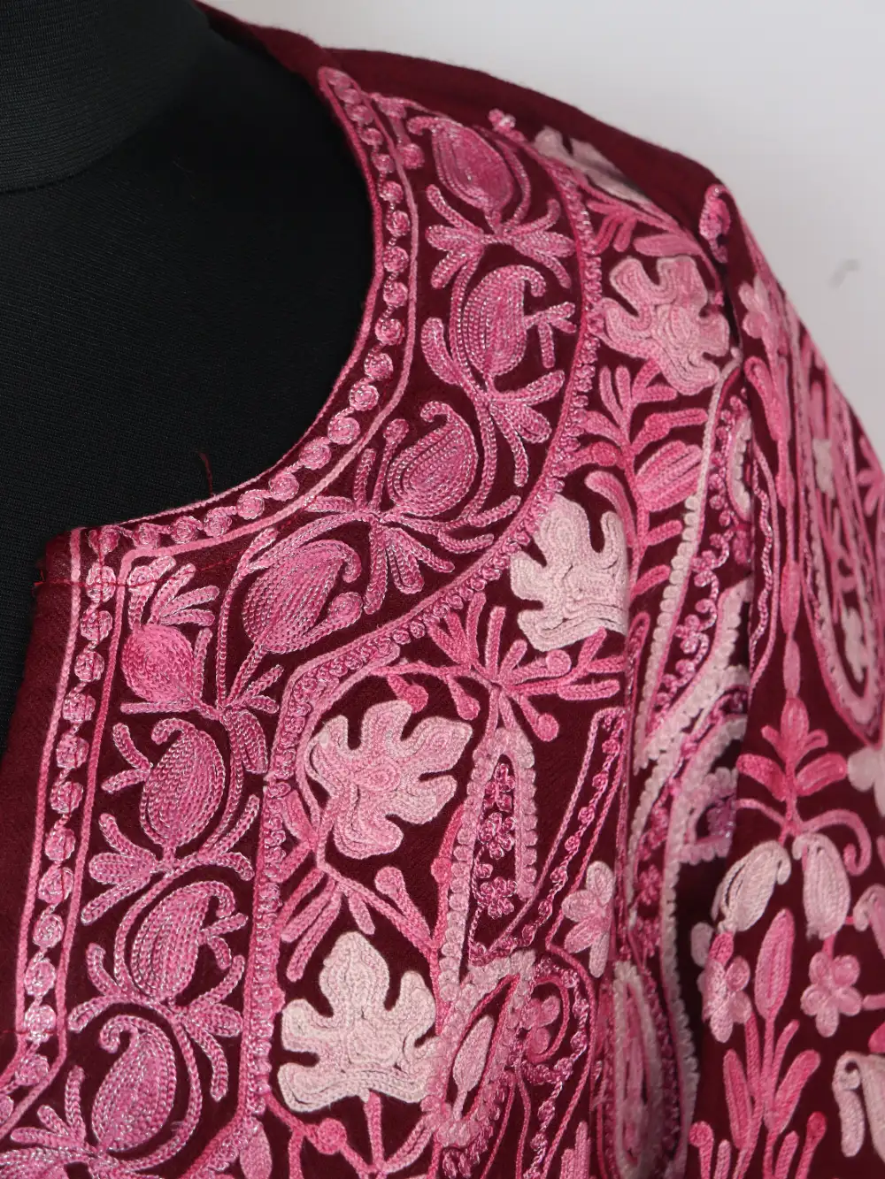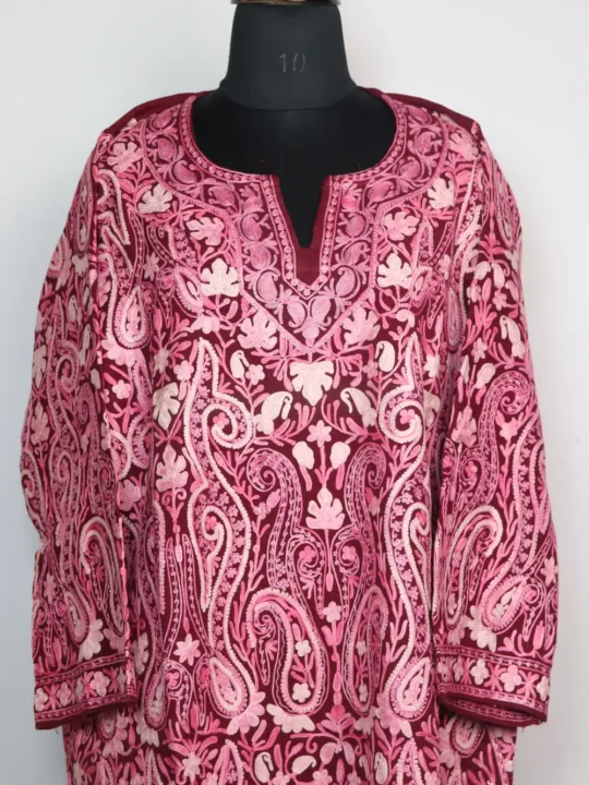 Crafted in raffal wool this maroon colour firan carries ease with a Kashmiri softness. It has been enriched with zari aari embroidery which is done all over it.