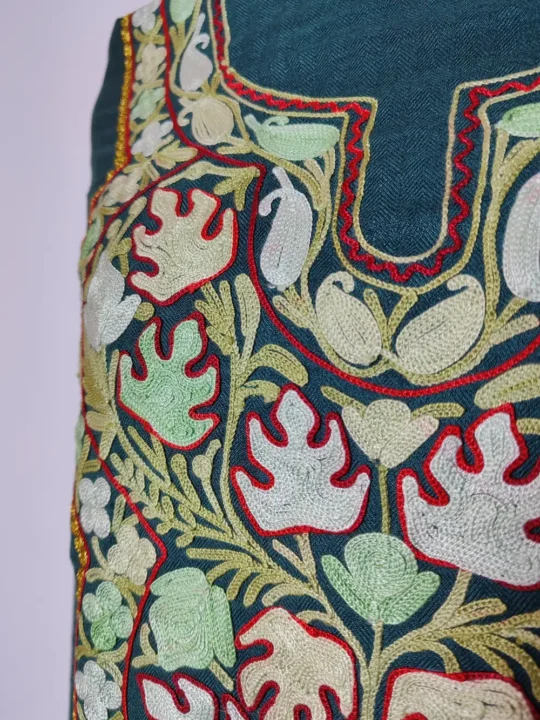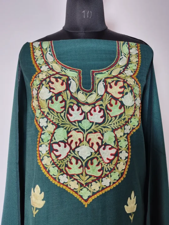 Cotswool unstitched suit fabric in sea green features aari work at the neckline in continuous badam and chinar pattern and front panel that showcases booti work. It comes as a 3pc set — in which you will find salwar, kameez and dupatta- all unstitched so that you may stitch it to your measurements.
