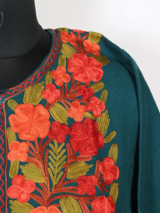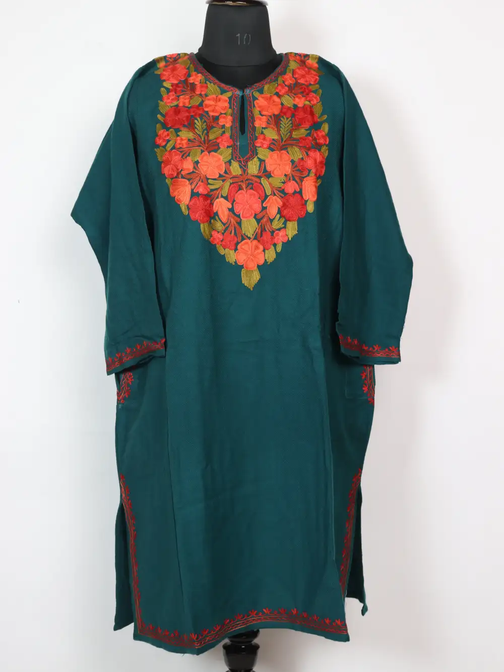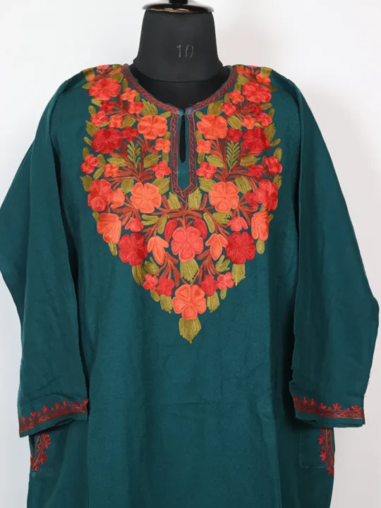 Cashmilon Wool gives a gentle weight to this Kashmiri sea green colour pheran, the neckline carryies red-orange Aari floral motifs in neat Kadhai. Comes in 50 inch chest size and 41 inch length with pockets on both sides, this Kashmiri feran keeps comfort at the fore while the neckline work adds a soft focal point. From our phiran online range this piece reads wearable and refined — you can order it easily from our website at just 1599rs when you want traditional warmth.