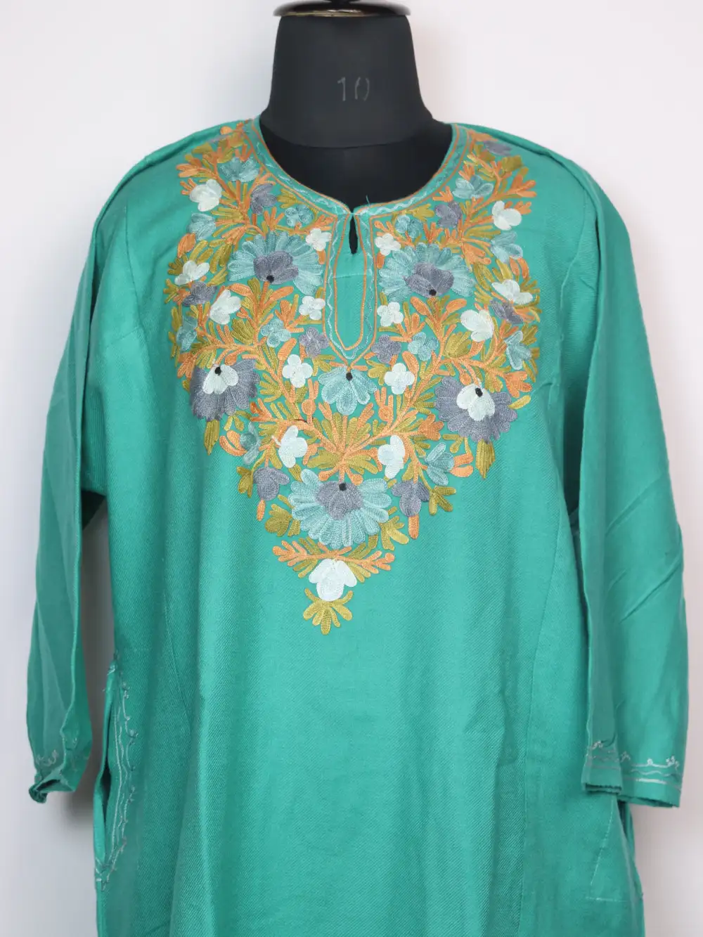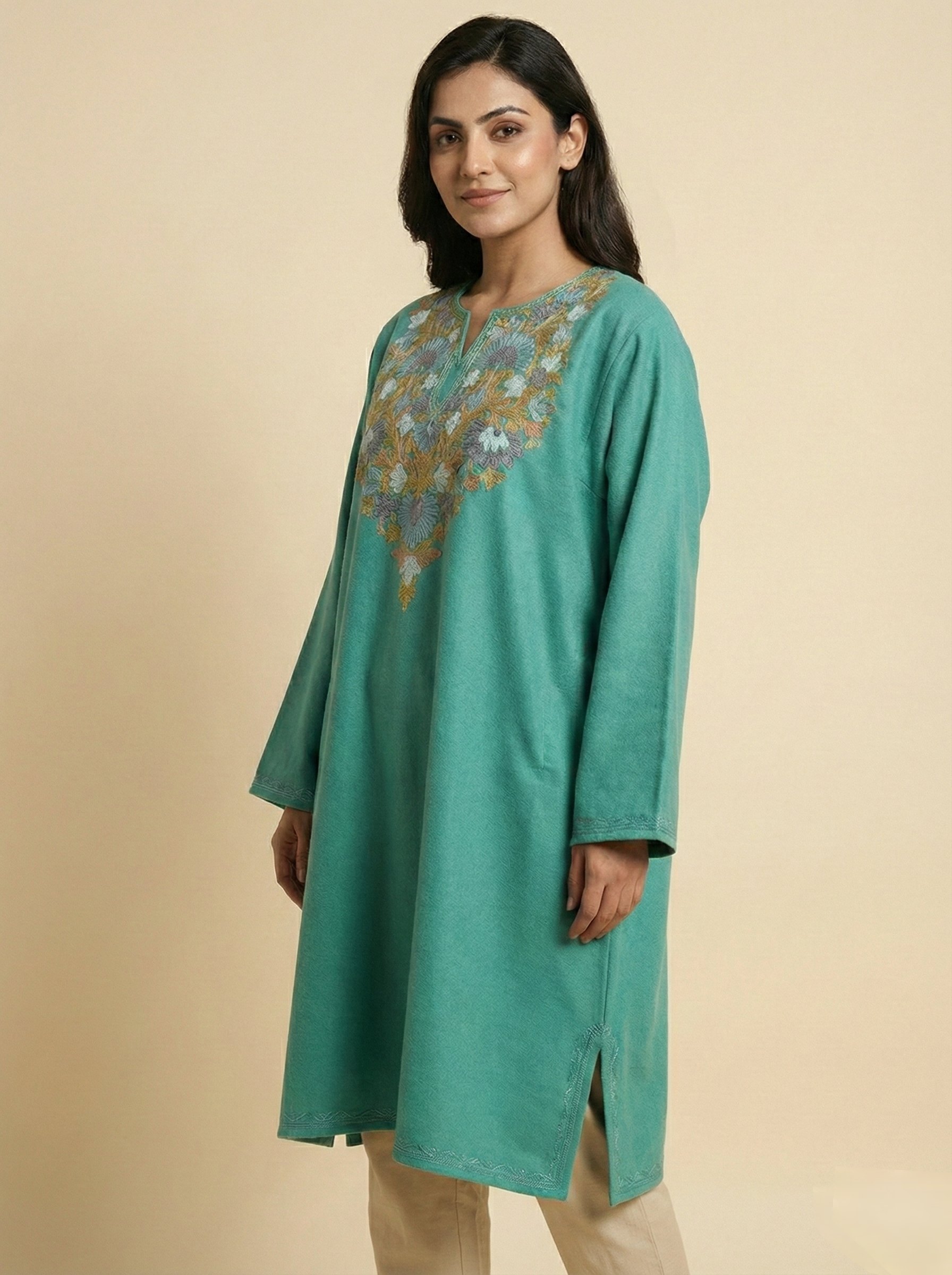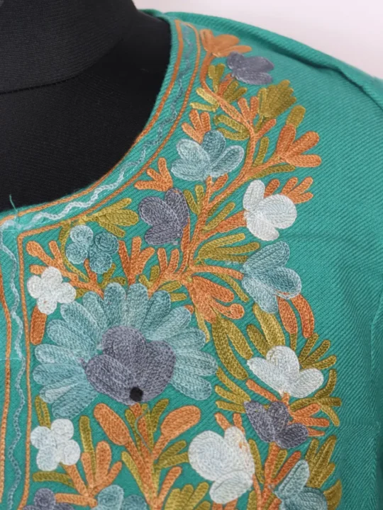 Designed using cashmilon wool for winter comfort, this Kashmiri feran is presented in sea green colour. It displays aari embroidery with floral work at neckline.