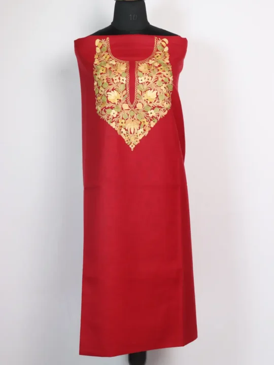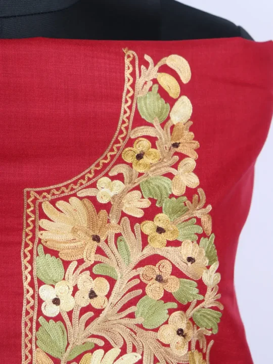 This red unstitched Ruby cotton 2pc suit gives you the freedom to tailor it into your perfect size and look. Its neckline carries Aari embroidery where yellow-brown florals are accented with leafy patterns stitched in green. This design adds character and grace to the fabric while keeping it easy to style. It is a smart choice for women who value everyday elegance with comfort.