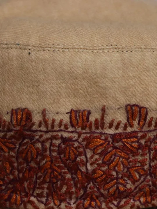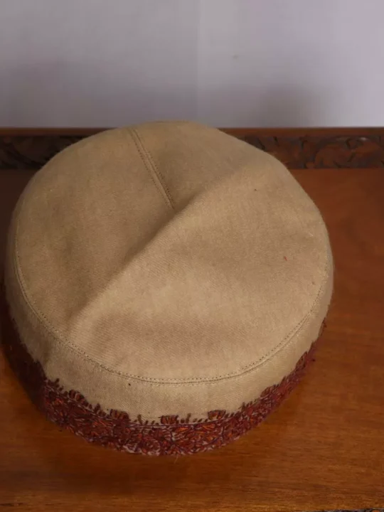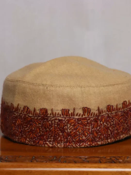 This is a beautiful made-in-Kashmir Semi pashmina cap or topi. Sozni embroidery on it has been done by hand by our skilled artisan