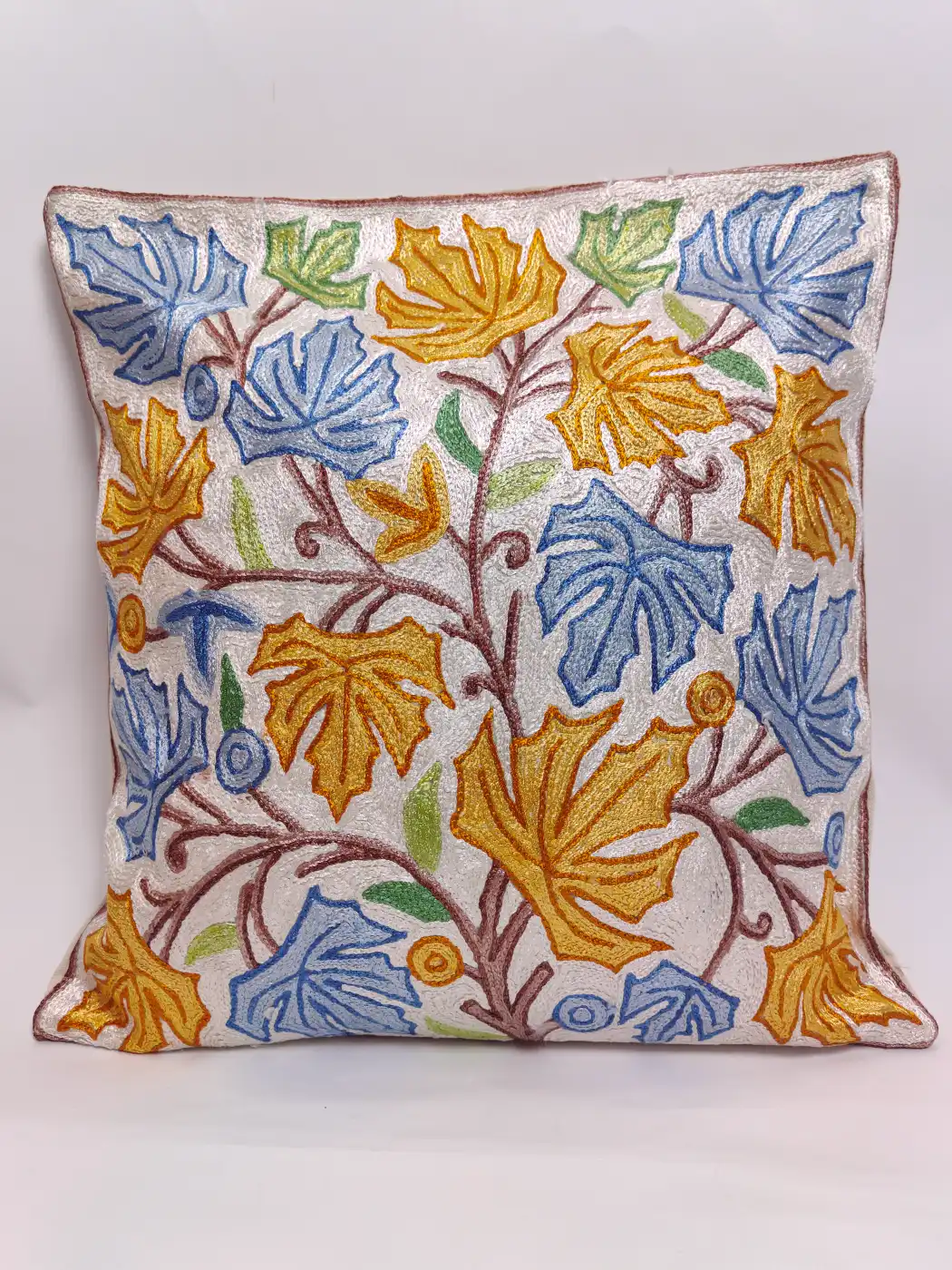 Designed in dusoot cotton for neat décor, this cushion cover features Kashmiri hand chain stitch embroidery created in silk threads. It showcases chinari motifs. It enriches seating, adds softness, guards cushions and gives charm to spaces.