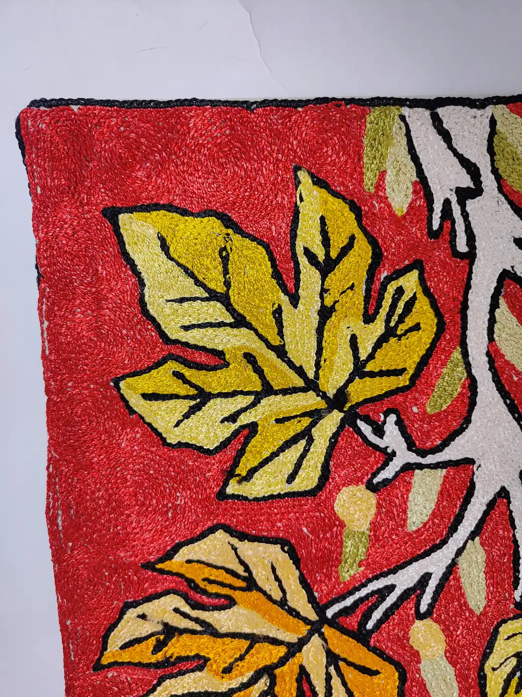 This set of chinari wall hanging feels rich the moment you see it. Its hand chain stitch embroidery fills the red fabric with chinar motifs spread all over, which creates a complete chinar-bagh effect. Each stitch is done by hand, which gives it depth. It is a beautiful statement for any space.
