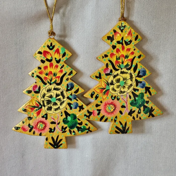 These festive trees are made in Srinagar using traditional Kashmiri paper mâché techniques, then painted by hand in cheerful holiday patterns. Perfect for tabletops, shelves, or gift baskets, these two yellow items bring a handmade touch to your Christmas décor. Light, colourful, and full of charm, they offer a beautiful blend of winter spirit and Kashmiri artistry