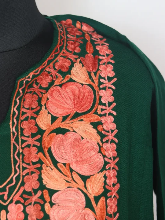 Made from cashmilon wool, this stylish Kashmiri pheran appears in dark green colour. It has been adorned with floral aari embroidery at neckline.It represents Kashmiri winter wear and includes both side pockets for usability.