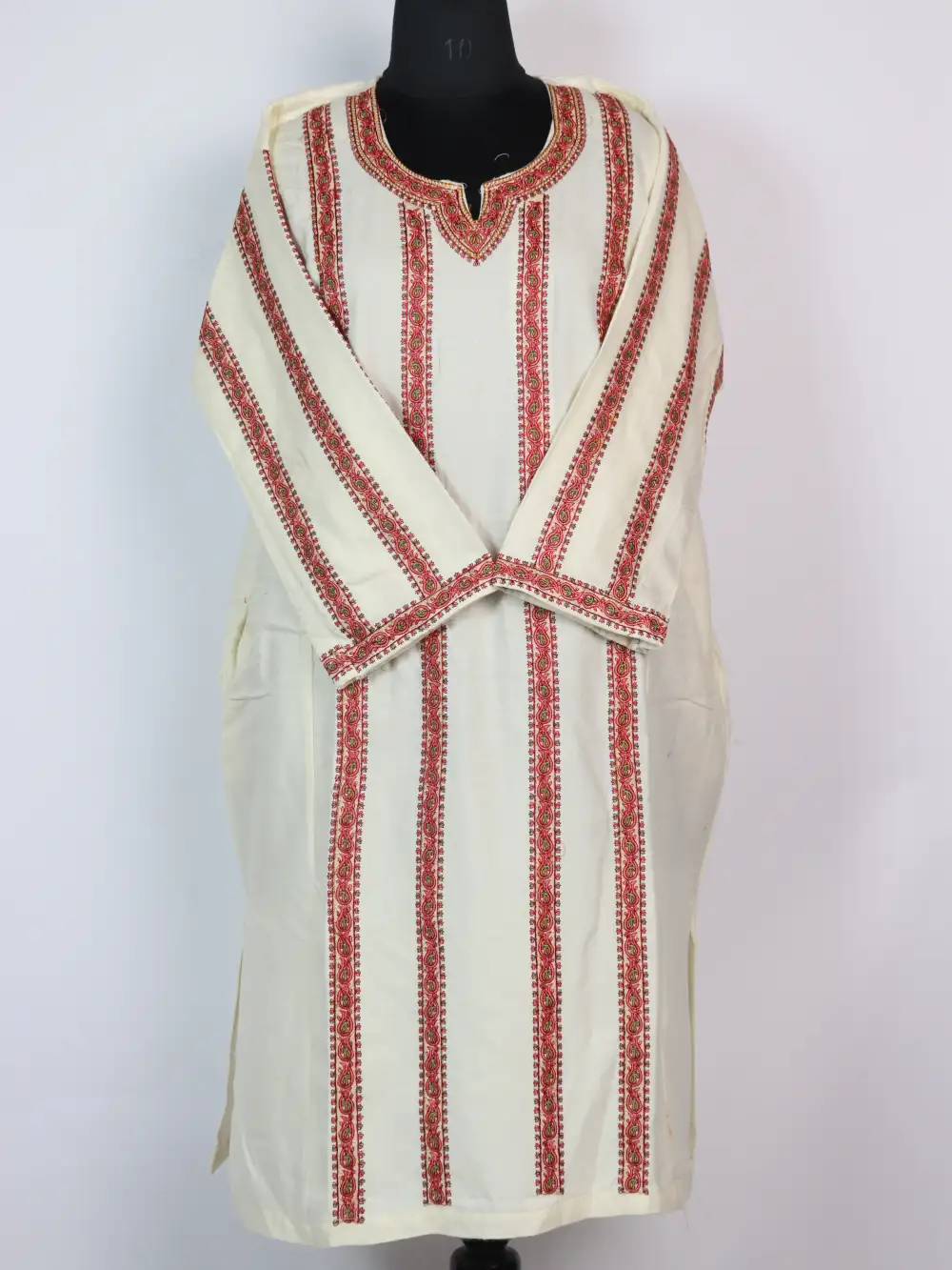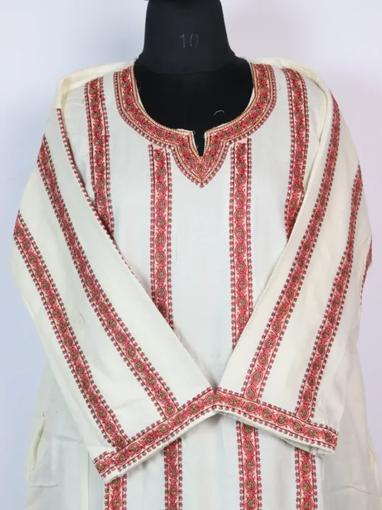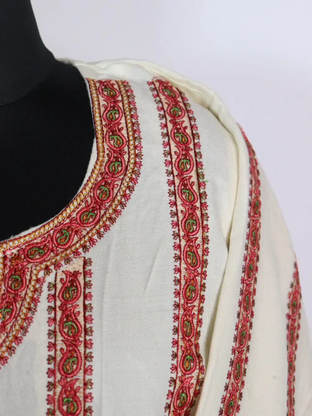 Designed in cashmilon wool, this white color pheran offers a gentle warmth for cold days. The Sozni threadwork is detailed with continuous badam motifs within linear patterns placed along the front panel and sleeves, created using magenta and green threads. It is simple yet stylish, it highlights elegance through minimal motifs. It is a graceful piece that becomes a natural part of winter wardrobes.