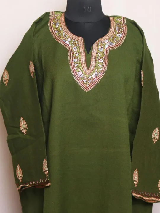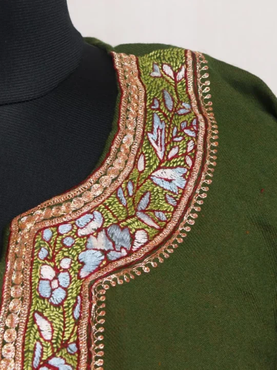Stay cozy and stylish this winter with our Shabnam Green Pheran.It is made from warm Raffal fabric, it feels great against your skin and keeps you snug on chilly days. The lovely Tilla embroidery gives it a classic and elegant look, while the hand Sozni work adds a special charm that reflects the beauty of Kashmiri craftsmanship. It’s the perfect addition to your winter clothing collection.