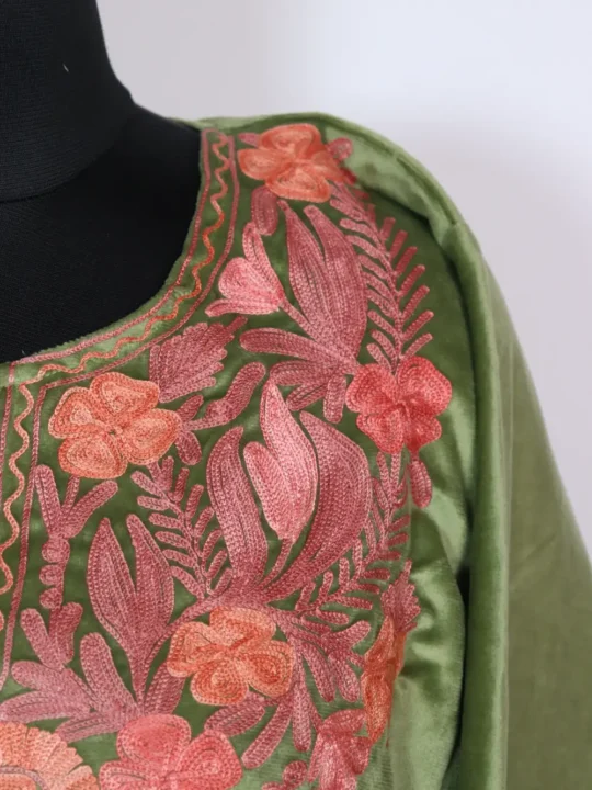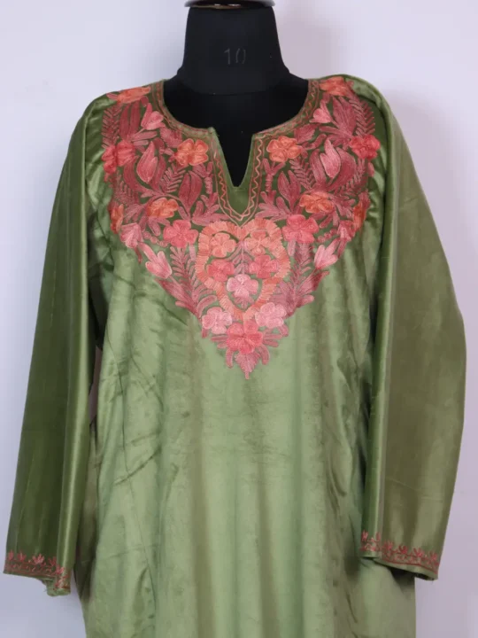 Soft velvet surface and floral Aari at the neckline define this green Kashmiri pheran, it comes in 49 inch chest size and 44 length for a relaxed fall — The Pheran keeps the body minimal while the neckline shows elegant detail