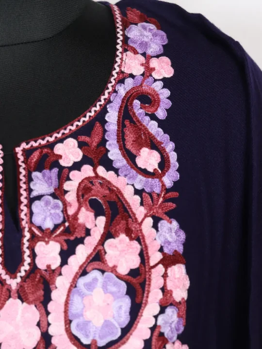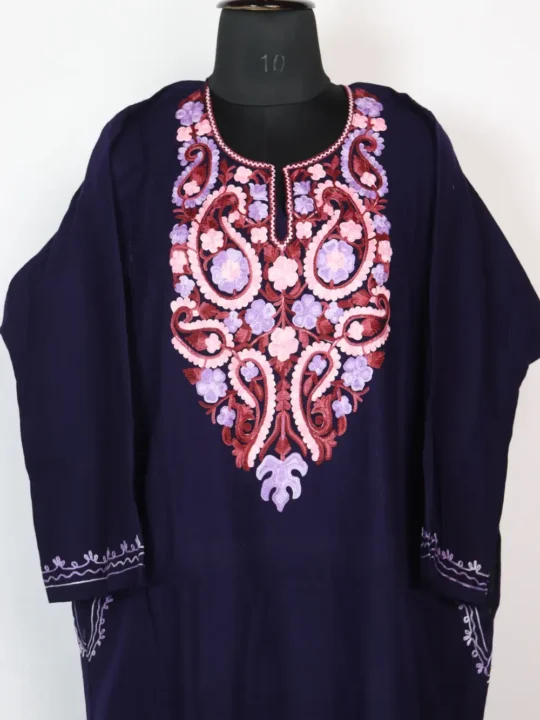 Blue Cashmilon wool shapes this pheran while Aari embroidery in badam style motifs by using pink and purple shade threads decorates its neckline with quiet charm. It comes in 52 inch chest size and 44 inch length, this item keeps relaxed and warm. For simple shopping, you can have this faran from kashmir online at just 1149 and you will be bringing home a neat, elegant piece that reads both traditional and wearable.