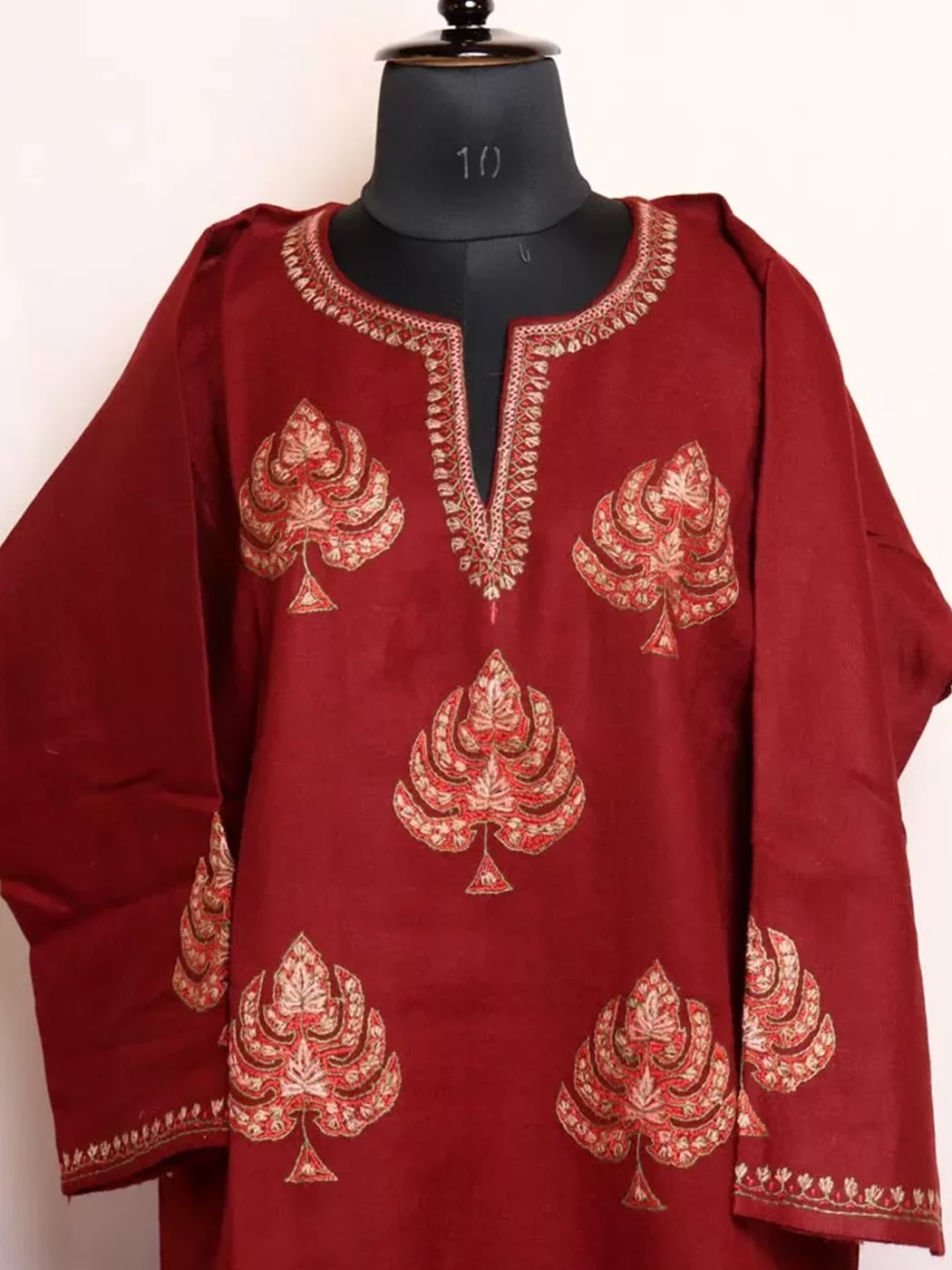 Embrace winter elegance with this exquisite Shahi Maroon Kashmiri Pheran, a masterpiece of traditional artistry. Crafted from premium Raffal Wool, this garment offers superior warmth and a soft, luxurious drape that is gentle against the skin. The deep royal base serves as a striking canvas for the authentic Chinari Sozni hand embroidery, showcasing delicate needlework that depicts the iconic Chinar leaf motifs of the valley—making this a true piece of wearable art.