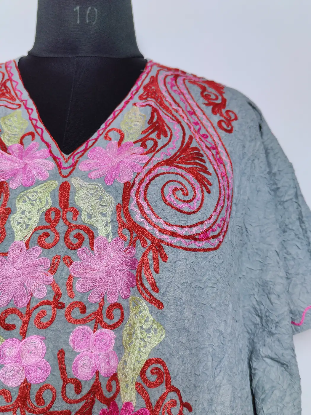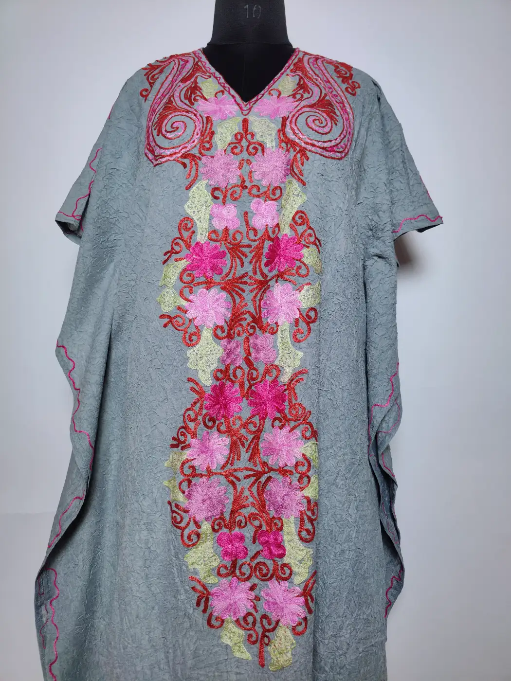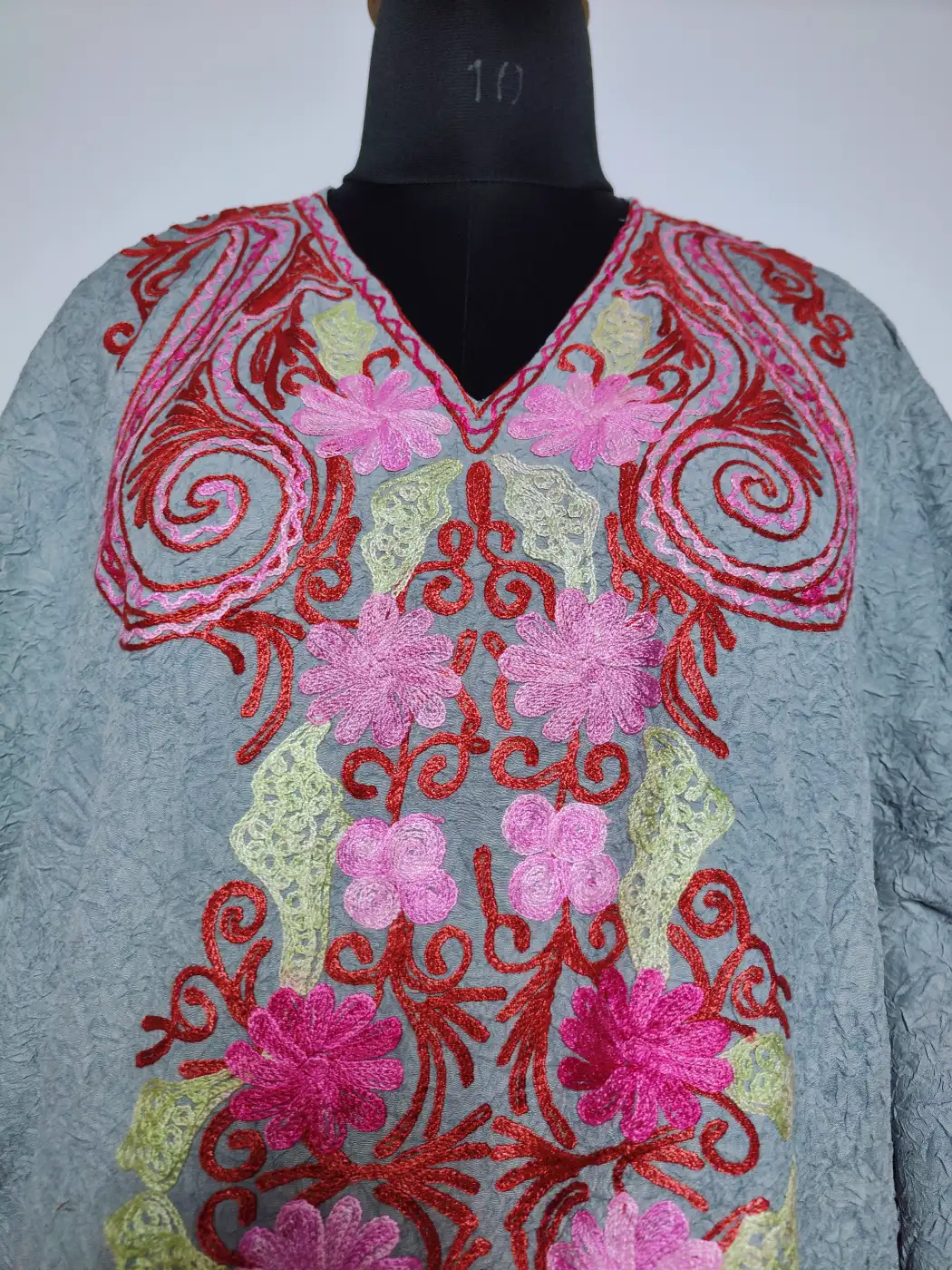 This Kashmiri aari work kaftan presents a calm grey tone with floral and badami embroidery at the neckline. Crafted in crush cotton using aari work, it offers a relaxed and flowing shape. The fitting of this kaftan creates a neat balance between comfort and traditional design.