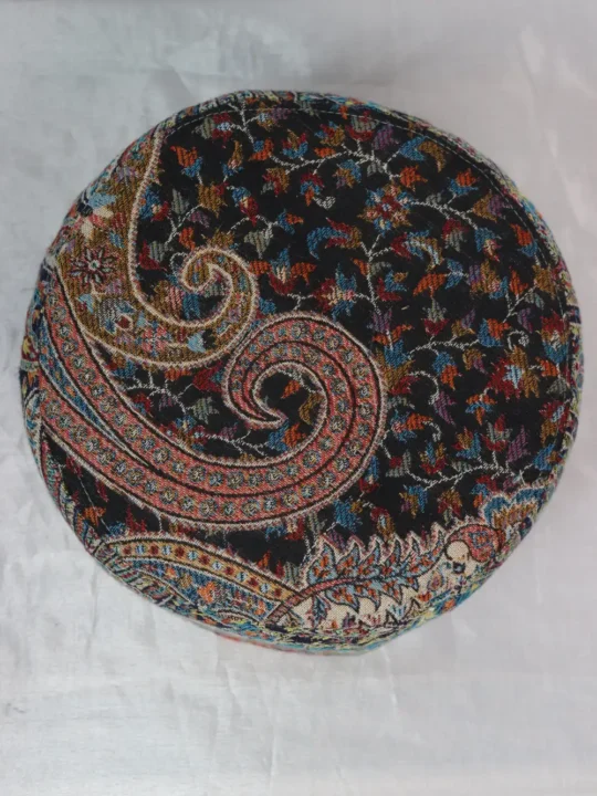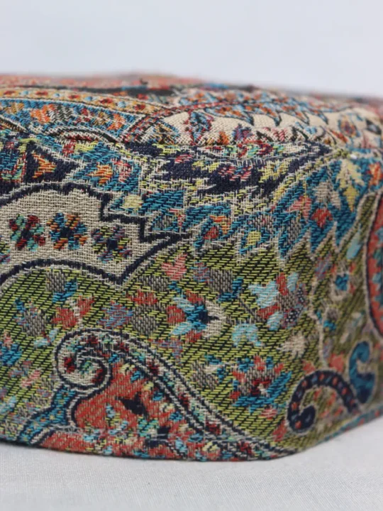 This 23 size traditional Kani Cap is adorned with a floral and badam motifs. This beige hue authentic cap exemplifies premium Kashmiri craftsmanship, suitable for gifting, formal wear, or casual elegance. It is soft, lightweight, and culturally expressive.