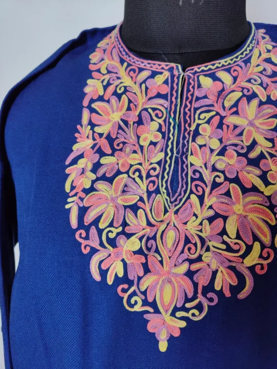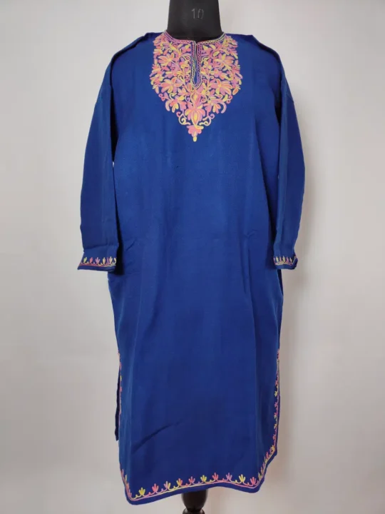 This 40-inch blue pheran made from Cashmilon wool fabric combines comfort with charm. Purple and yellow threaded floral Aari embroidery along the neckline adds a lovely accent. Its easy drape and smooth texture make it a delight to wear. Priced at ₹1299, it’s a warm and affordable choice for those who prefer understated elegance in winterwear.