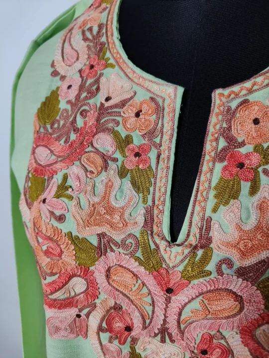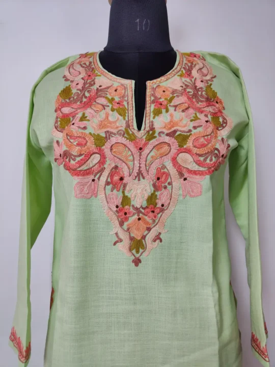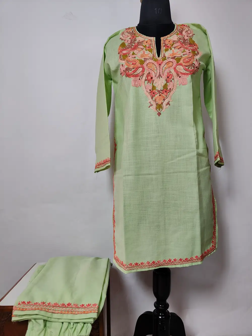 This sage green color kurti set is crafted from ruby cotton and comes as a complete two-piece outfit. The neckline is embroidered with Aari work in pink-green threaded chinar, badam with floral motifs, which adds charm to its simple design. Its breathable fabric makes it a good choice for warm weather, while the coordinated style keeps it graceful. It is a set that combines comfort, lightness, and beauty, perfect for regular wear with timeless appeal.