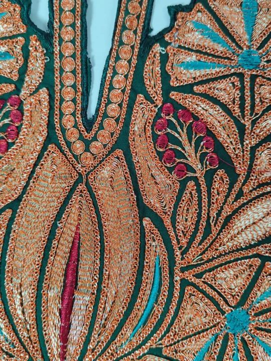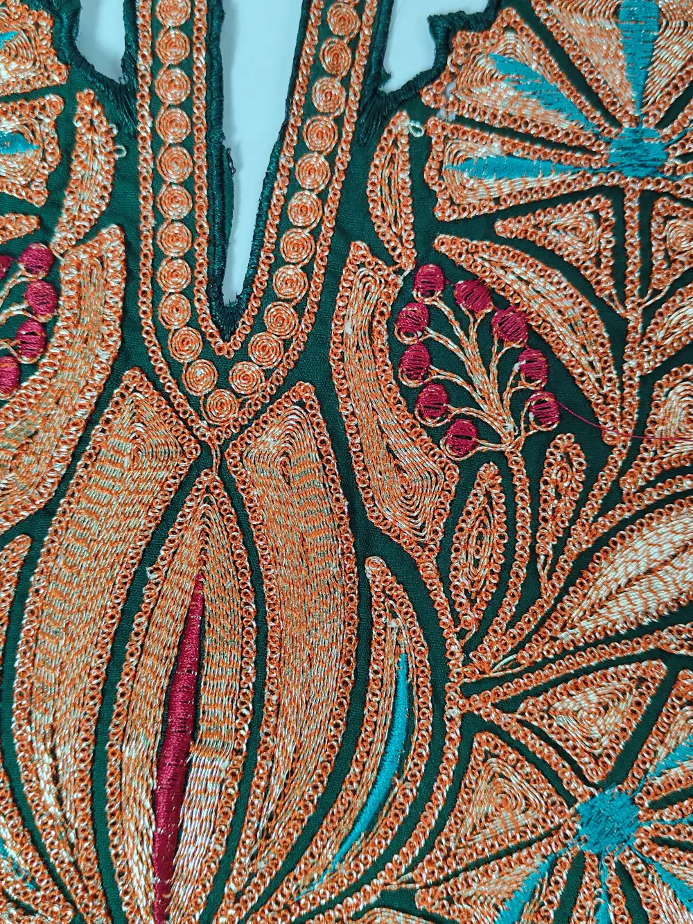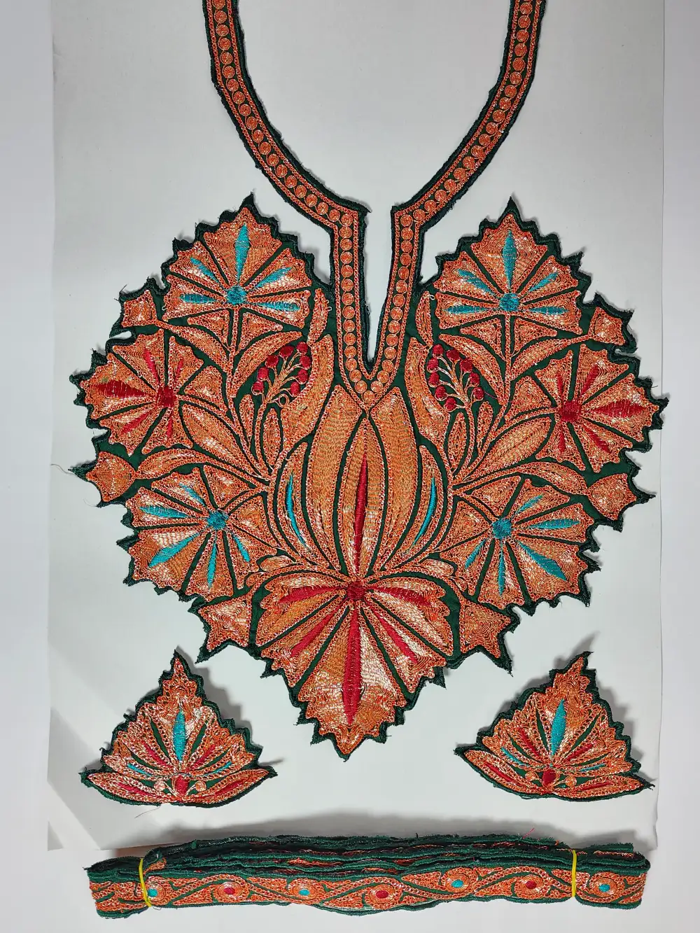 Embellished on dark green colour base with fine tilla work, this patch shows Kashmiri elegance. It can enhance pheran designs, kurti patterns, or shirt detailing.