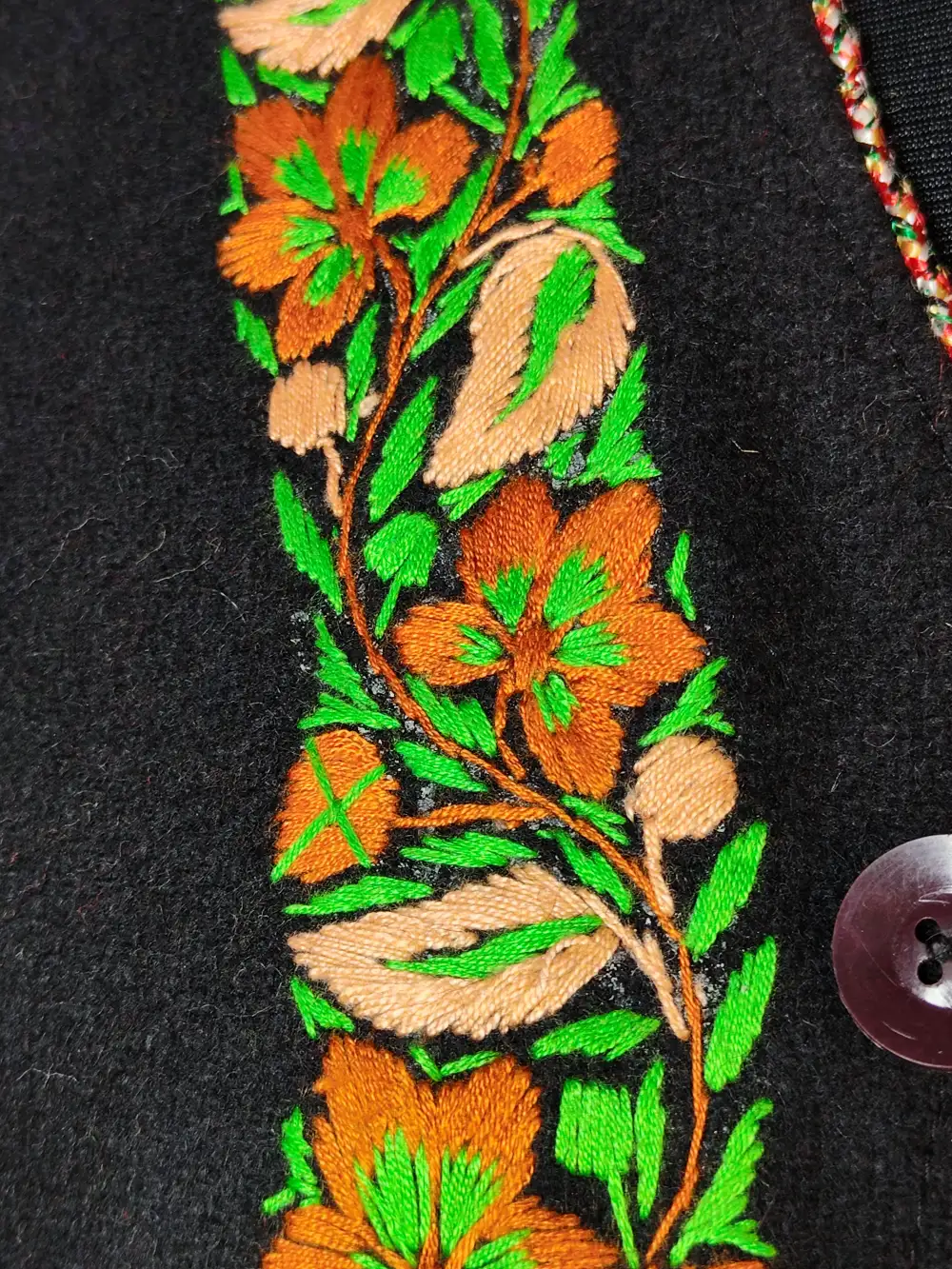 Prepared from blazer tweed suitable for winters, this women’s coat arrives in black colour. Its floral aari embroidery enhances border and front panel vertically.