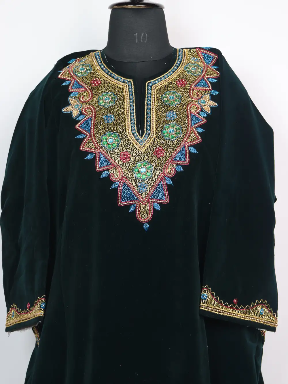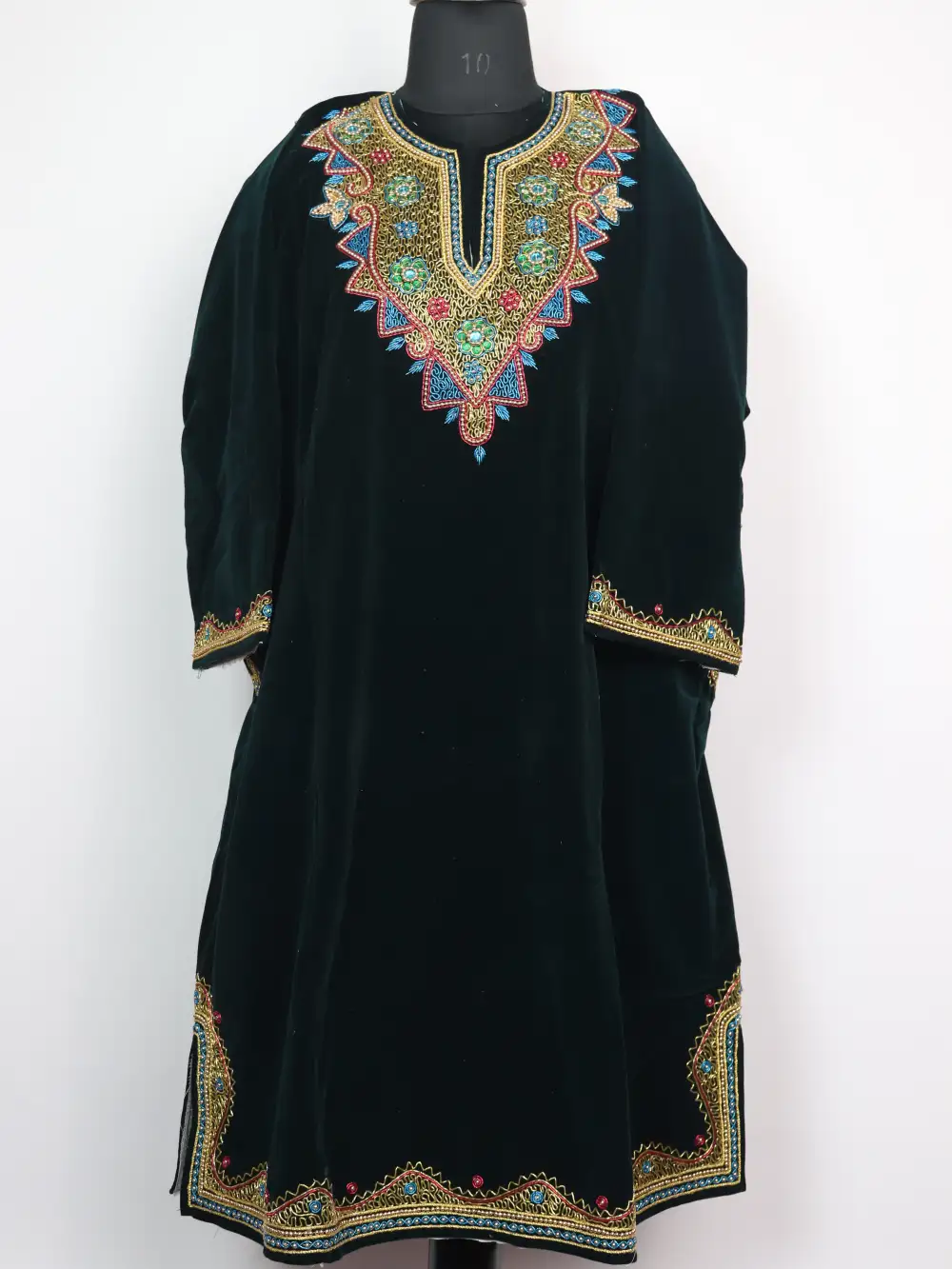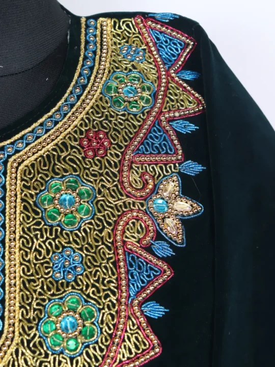 This dark sea green Velvet pheran is a graceful everyday layer, it comes with pockets both side for practical use. Its neckline is worked with dabka embroidery in curved patterns that add texture and subtle rhythm.