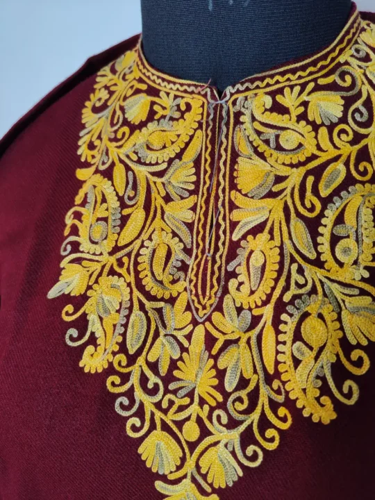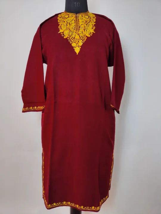 A bright winter pick, this maroon pheran in Cashmilon fabric features badam and floral mustard embroidery along its neckline. Its 40-inch length offers a comfortable and relaxed fit. It is ideal for daily wear, it pairs easily with any winter piece. At under ₹1300, it’s a lovely way to enjoy warmth and colour without compromising on affordability.