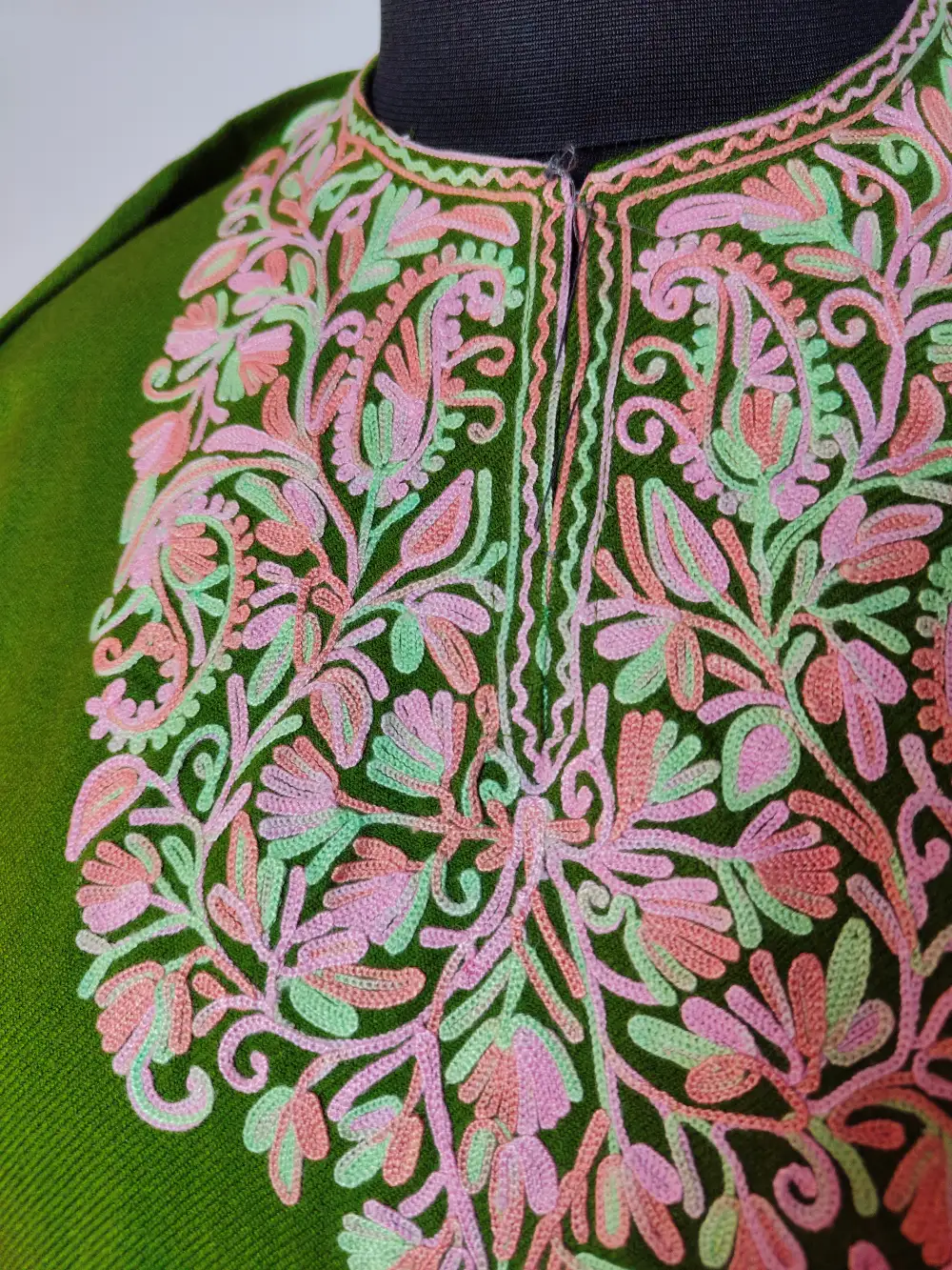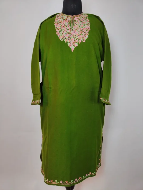 This 40-inch green pheran in cashmilon wool fabric brings together a soft feel and lively detail. Its neckline is graced with pink and green badam floral Aari embroidery that stands out beautifully. It is designed for everyday wear, it provides warmth without heaviness. At just ₹1299, it offers an affordable way to stay stylish and snug through the colder months.