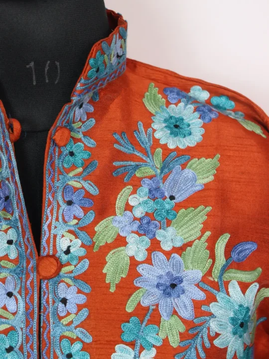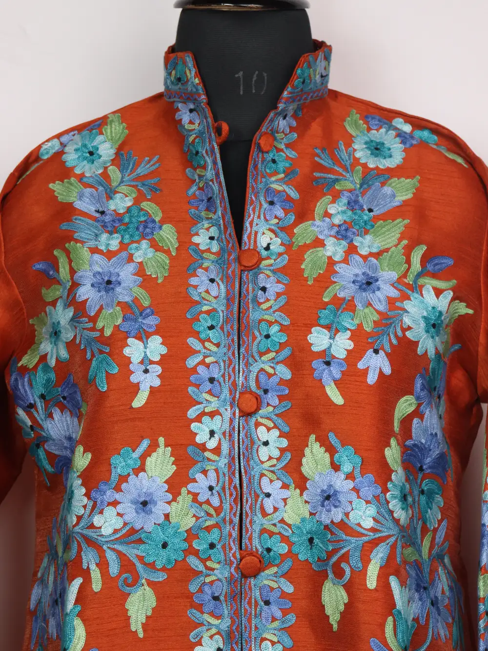 Rust short coat features Aari embroidery at the collar and all over front stitched as cascading floral motifs. It comes with lining and has length 31 inches while chest size 41.