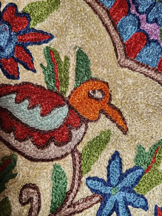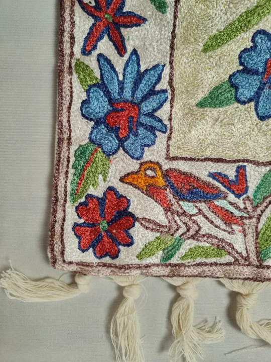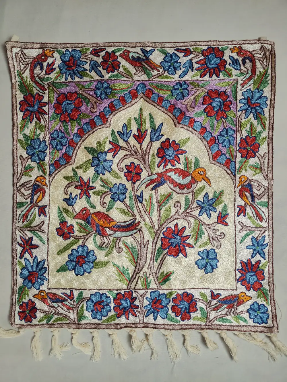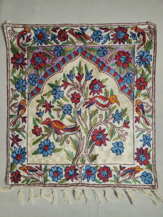 Sized 2×2 feet, this Kashmiri wall hanging is embroidered on dusoot cotton with silk chain stitch. Birds perched on delicate branches form the centrepiece, while a dome-like design at the top balances the artwork. It’s a fine example of Kashmiri creativity, which blends nature with symmetry. Perfect for hallways or living rooms, it adds elegance and craft to modern homes.