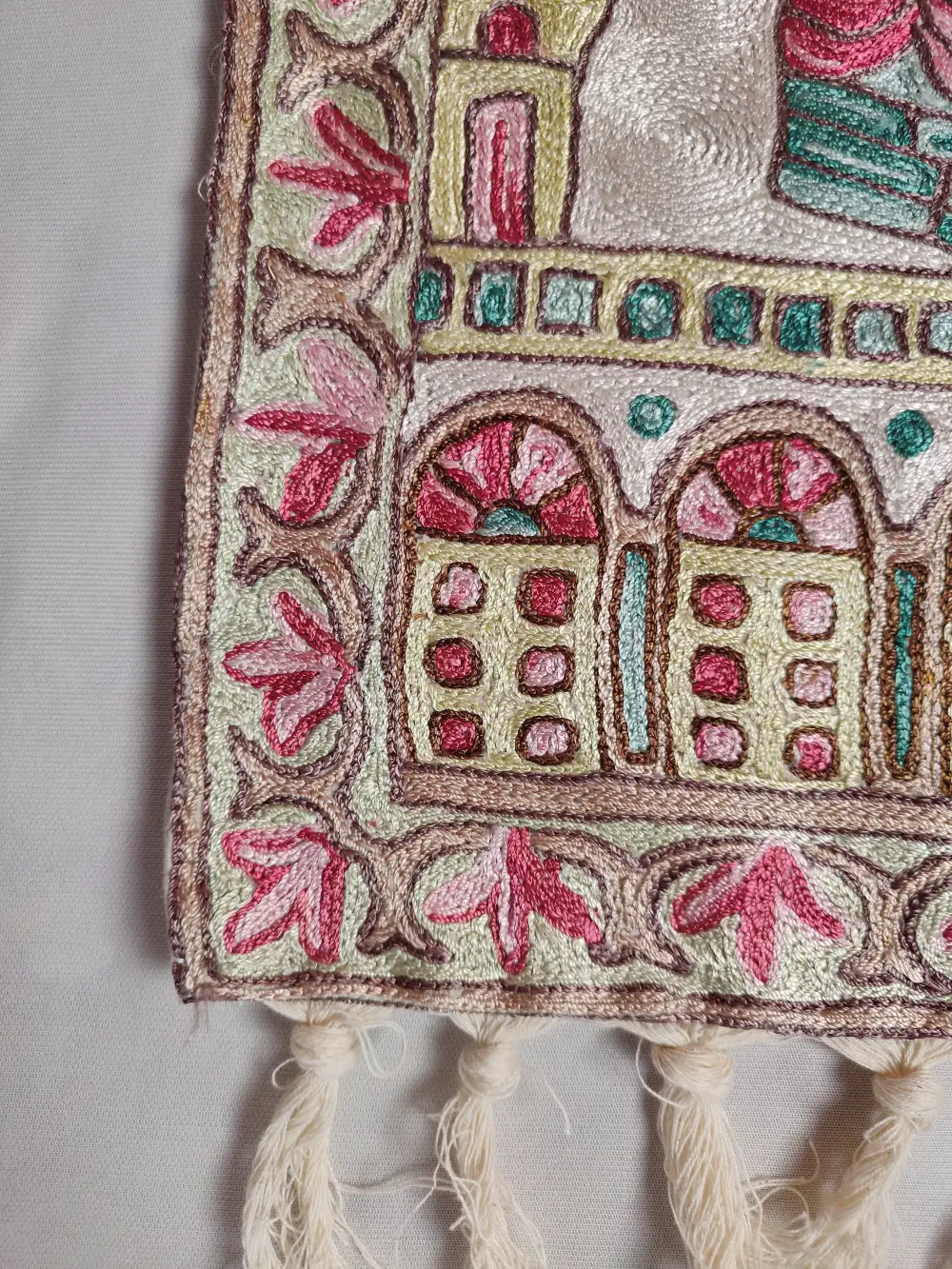 Sized 1×1 feet, this Kashmiri wall hanging is hand embroidered with silk chain stitch. It illustrates the Kaba in a design that feels both devotional and artistic. With its neat borders and detailed imagery, the piece is suited for display in prayer areas or as a symbolic reminder of faith. It is a beautiful expression of Kashmiri craft blended with reverence.