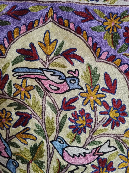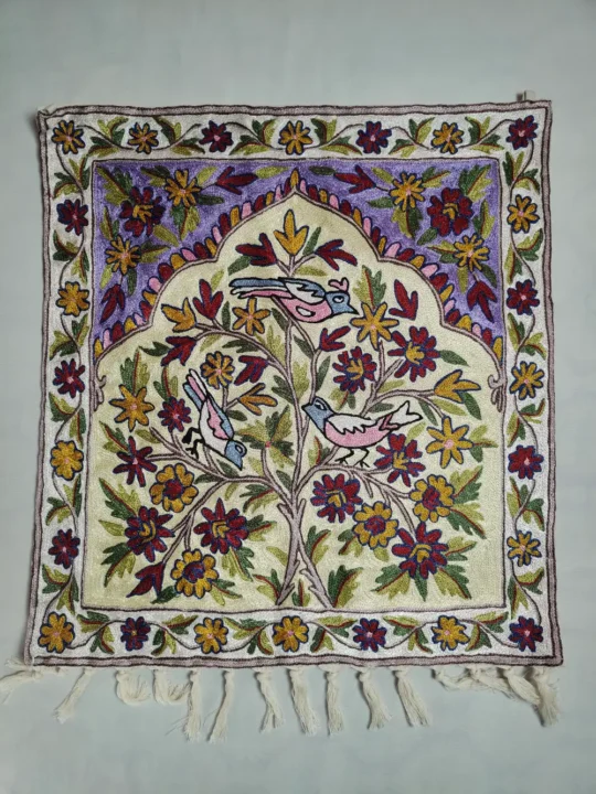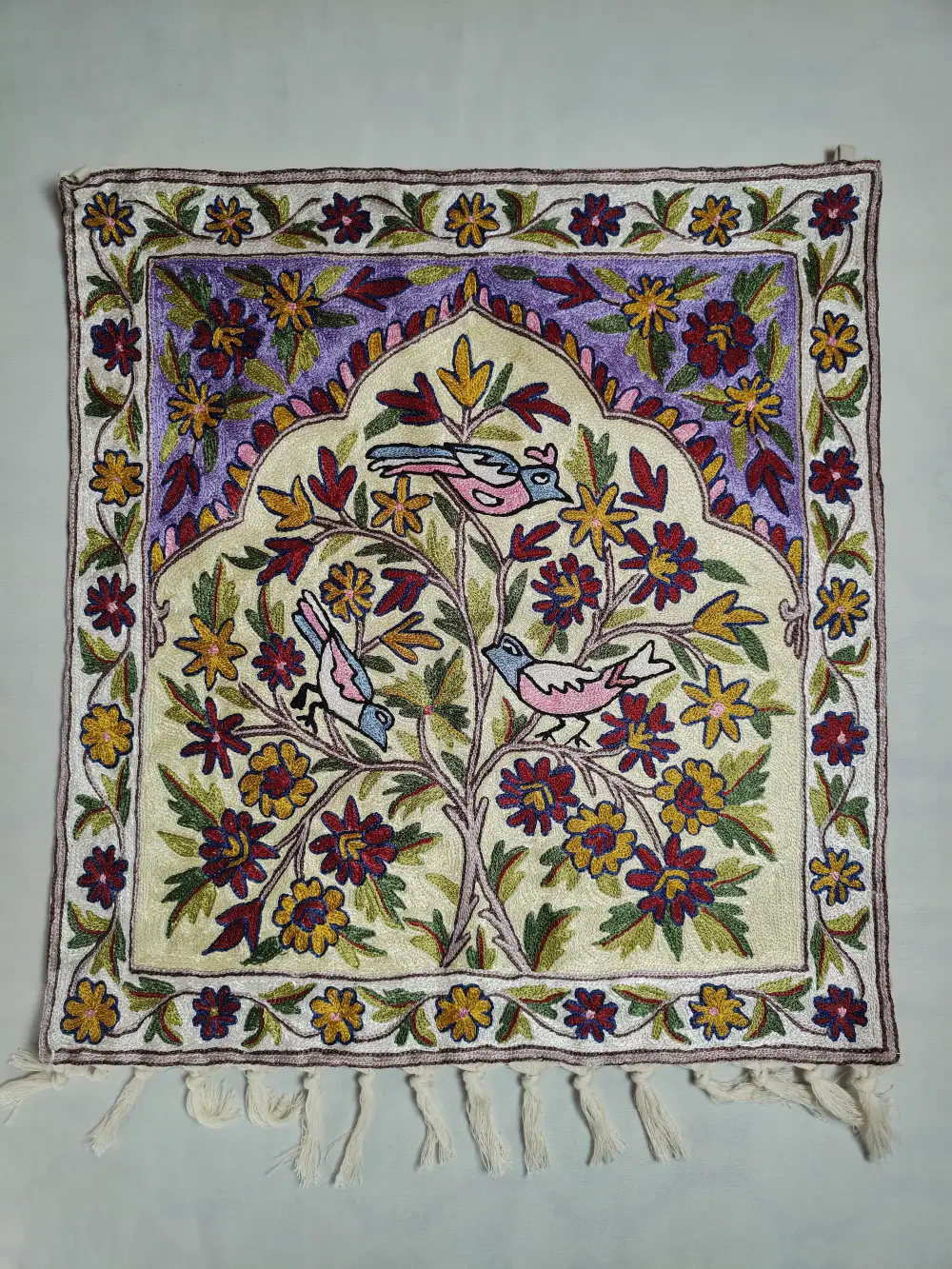 This 2×2 feet Kashmiri wall hanging reflects skilled embroidery done in silk chain stitch over dusoot cotton. The imagery of birds resting on branches with a dome-like structure above creates harmony in design. It is light in weight but rich in detail, it makes an ideal wall accent. It is a perfect choice to bring Kashmiri artistry into interiors while keeping the space fresh and refined.