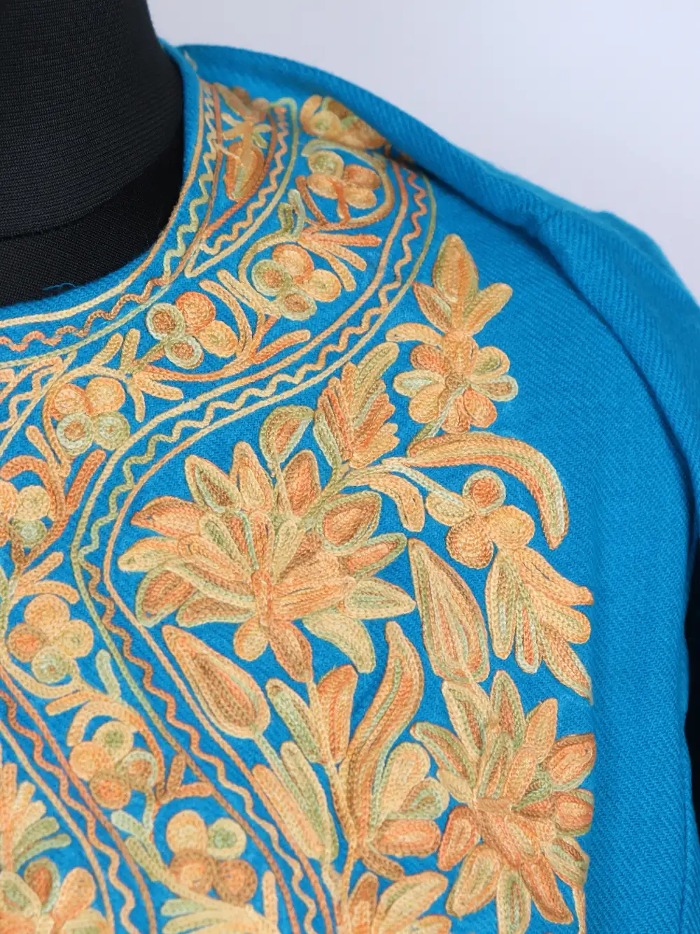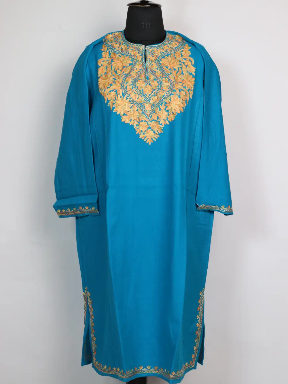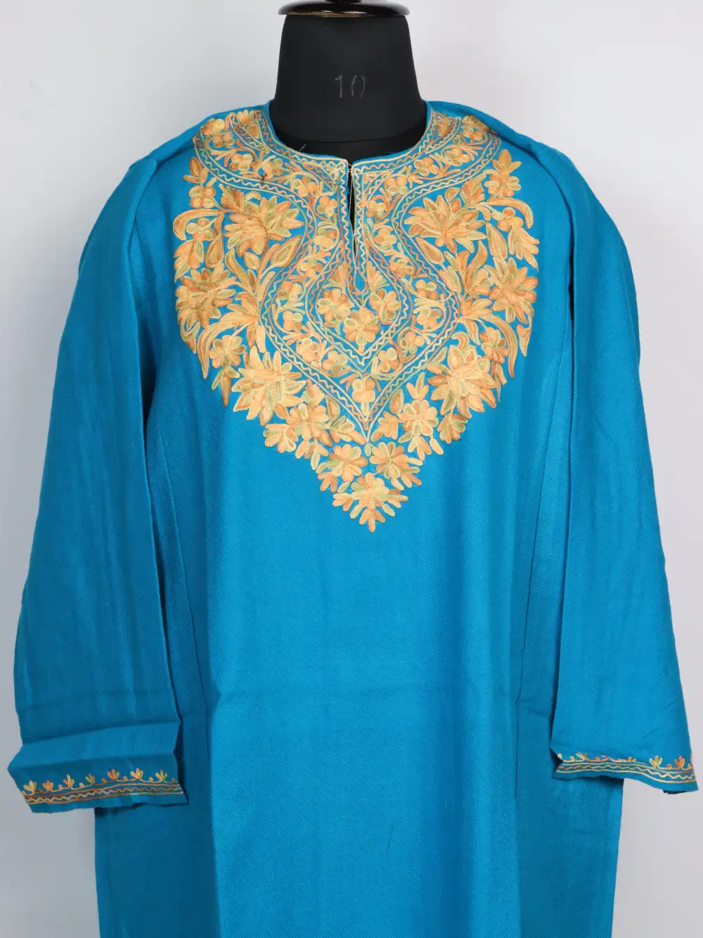 This stunning Cashmilon wool pheran features delicate golden floral Aari embroidery that adds charm to its vibrant blue base. It has a chest size of 50 inches and a length of 42 inches.