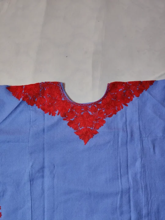 Warm in Cashmilon Wool, the stylish Kashmiri pheran shows floral Aari at the neckline. It comes with length 43 whicg give roomy ease. This pheran layers beautifully, offering simple elegance with a quiet Kashmiri feel for everyday winter wear.
