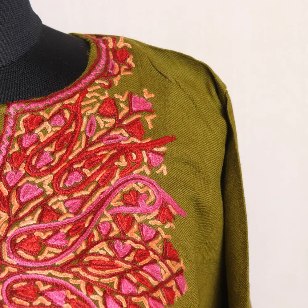 This mehndi green Raffal pheran is a masterpiece of comfort and artistry. It features stunning Hand Aari embroidery and it blends tradition with modern style, which makes it a versatile option for winter wear.