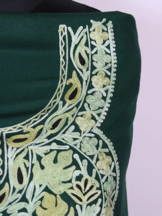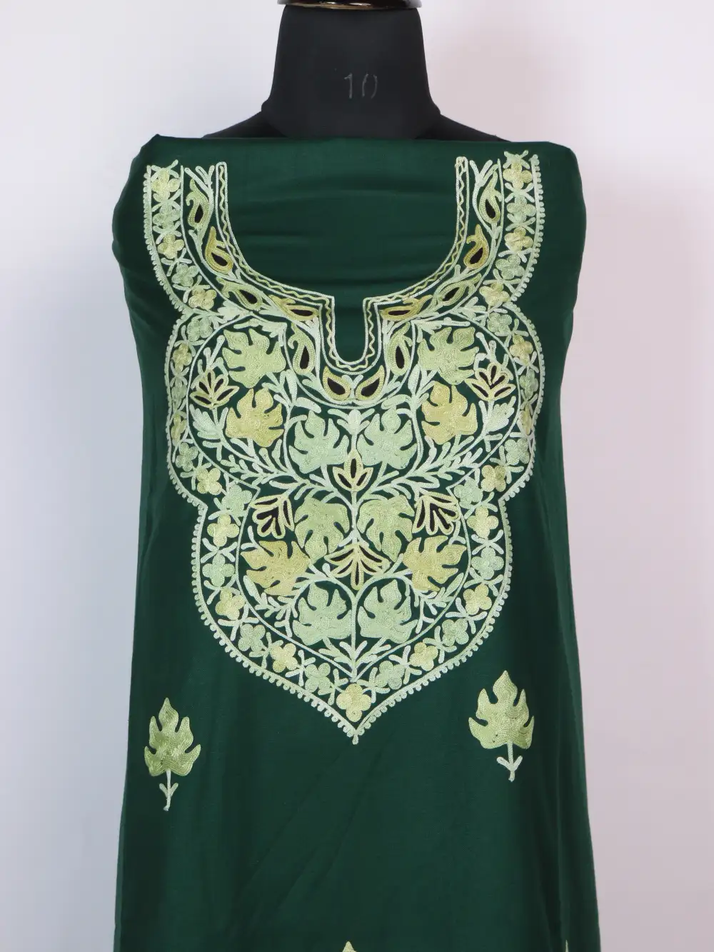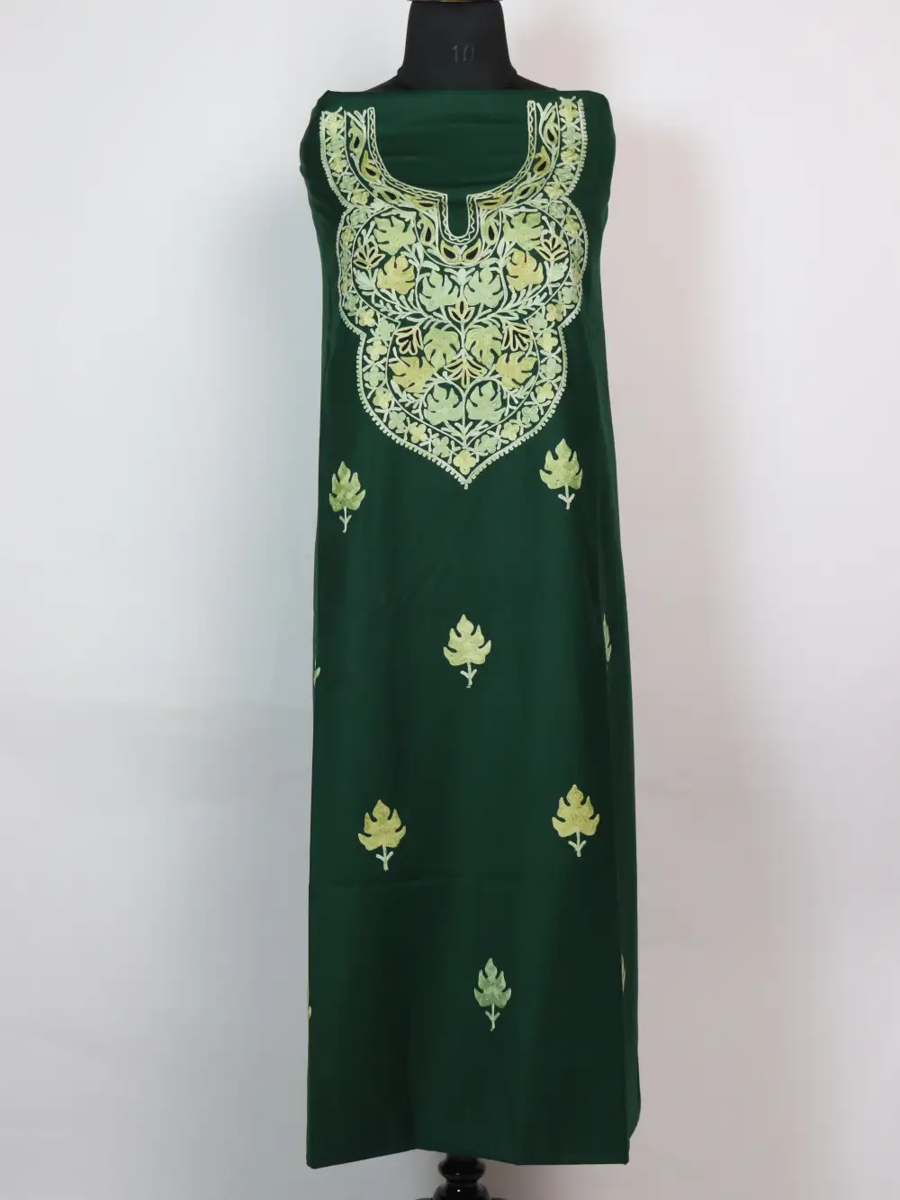 Rich spun fabric shapes this dark green 2pc Suit made for winter as a true woolen suit, it comes unstitched so you may stitch it to your perfect fit. Green threaded tiny badam motifs along with floral and chinar sit at the neckline and a Chinar booti appears on the front panel. It practicality meets craft with neat finishing and a look that reads quietly elegant; find it under kashmiri designer suits when you browse similar pieces.