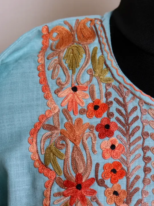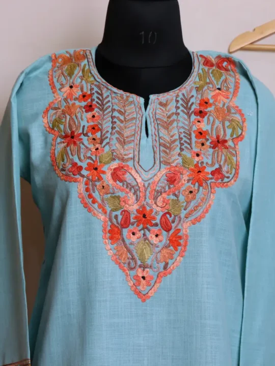 This cotton Kashmiri short kurti pant set is designed for effortless elegance, It features intricate Aari embroidery, it adds a traditional yet stylish touch to your wardrobe. Its lightweight fabric makes it perfect for everyday wear while keeping you comfortable all day, pair it with statement accessories for a chic and graceful Kashmiri inspired look