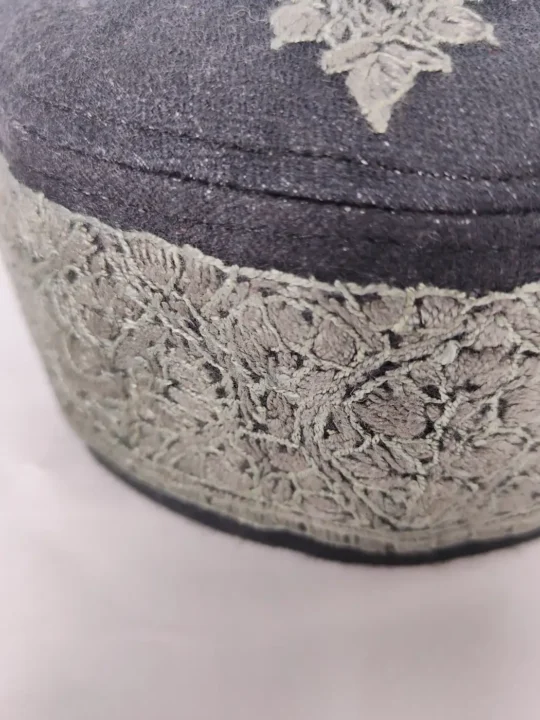 Crafted in soft MP pashmina, this black colour cap showcases graceful hand sozni embroidery inspired by traditional Kashmiri artistry. Its crown features an elaborate paisley medallion which is surrounded with delicate floral accents, while the side band of this cap carries a continuous vine of tiny blossoms. It is very light in feel yet refined in appearance, brings timeless elegance to everyday wear.