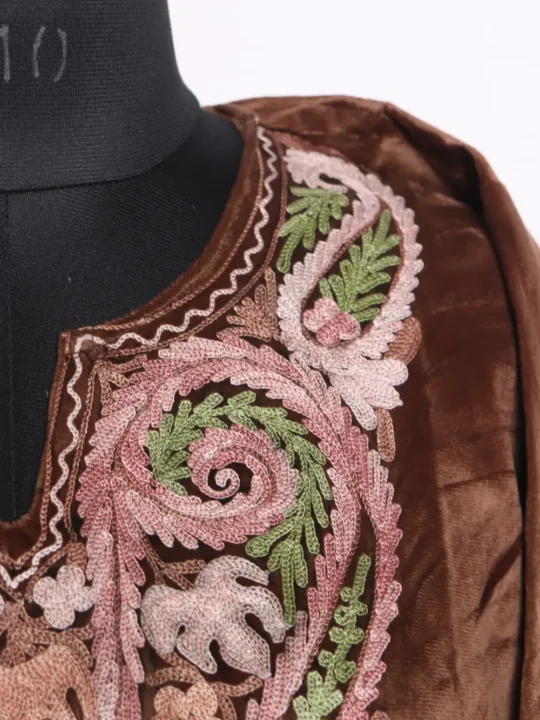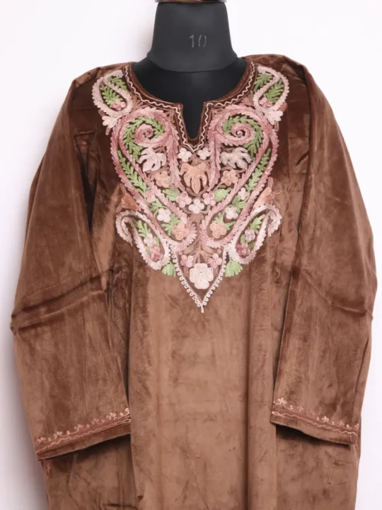 A soft Makmal velvet surface and chinar and badam motif Aari at neckline in brown threads and green leaf motifs balance warmth and detail on this brown fheran which is sized at 60 inch chest and 44 inch length. This neckline embroidery lifts the face without overwhelming the drape of the Pheran while the rest of the body stays quiet. This fieran fits well into winter wardrobes and appears under kashmiri pheran design searches for elegant neckline work.