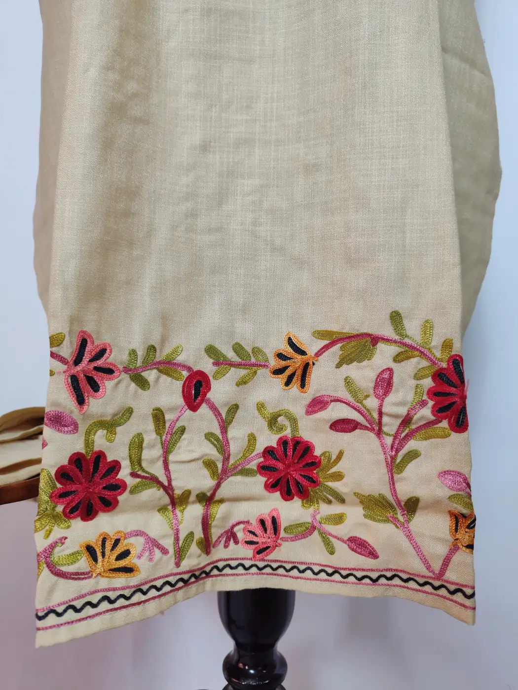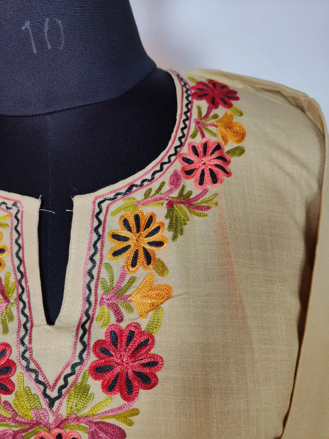 Kashmiri embroidery coord set has been made in ruby cotton fabric. It includes kurti with trouser. cream colour base has been enhanced by floral Kashmiri aari embroidery at neckline and daman.