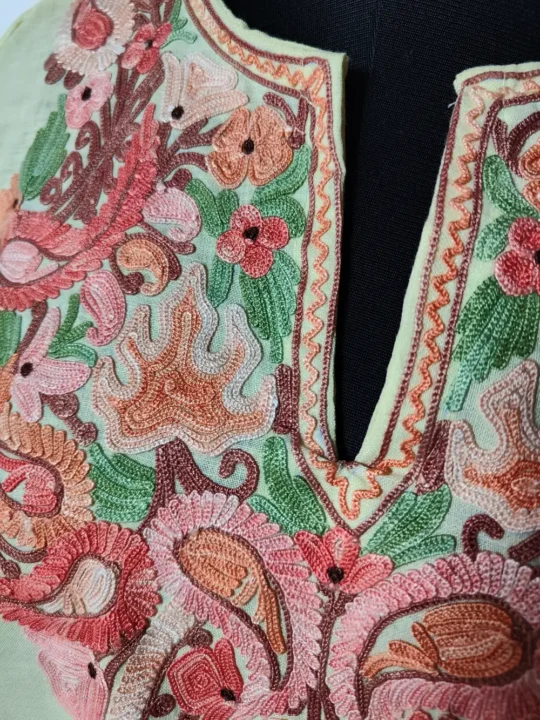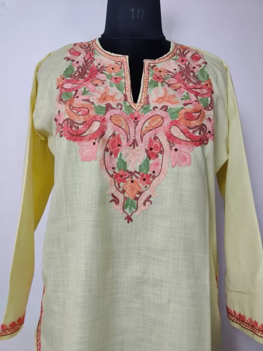 This light yellow ruby cotton kurti set brings comfort and grace together in a simple two-piece outfit. The neckline carries red-pinkish badam and chinar patterns and green leafy motifs embroidery in Aari work, offering a refined look. This fabric is light and breathable, that makes it ideal for regular wear. With both top and bottom included, it creates a complete appearance that feels practical while still carrying an air of elegance.