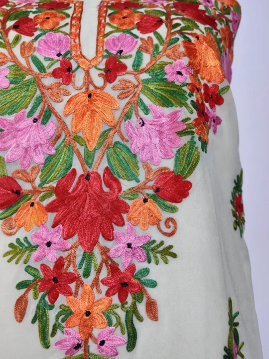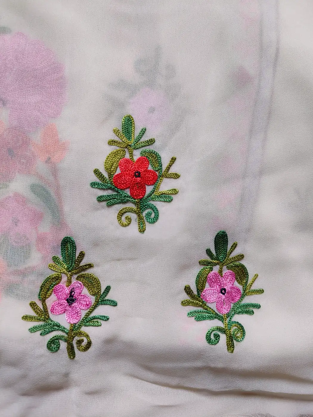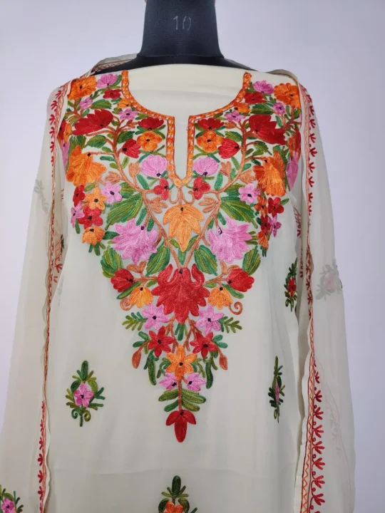 A softly embroidered neckline draws attention first in this georgette Kashmiri salwar suit. Bootis fill the rest of this white fabric, while the dupatta is finished with heavy borders. This unstitched 3pc set includes kurti, salwar, and dupatta for custom stitching.
