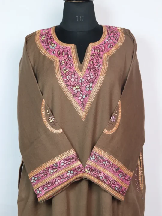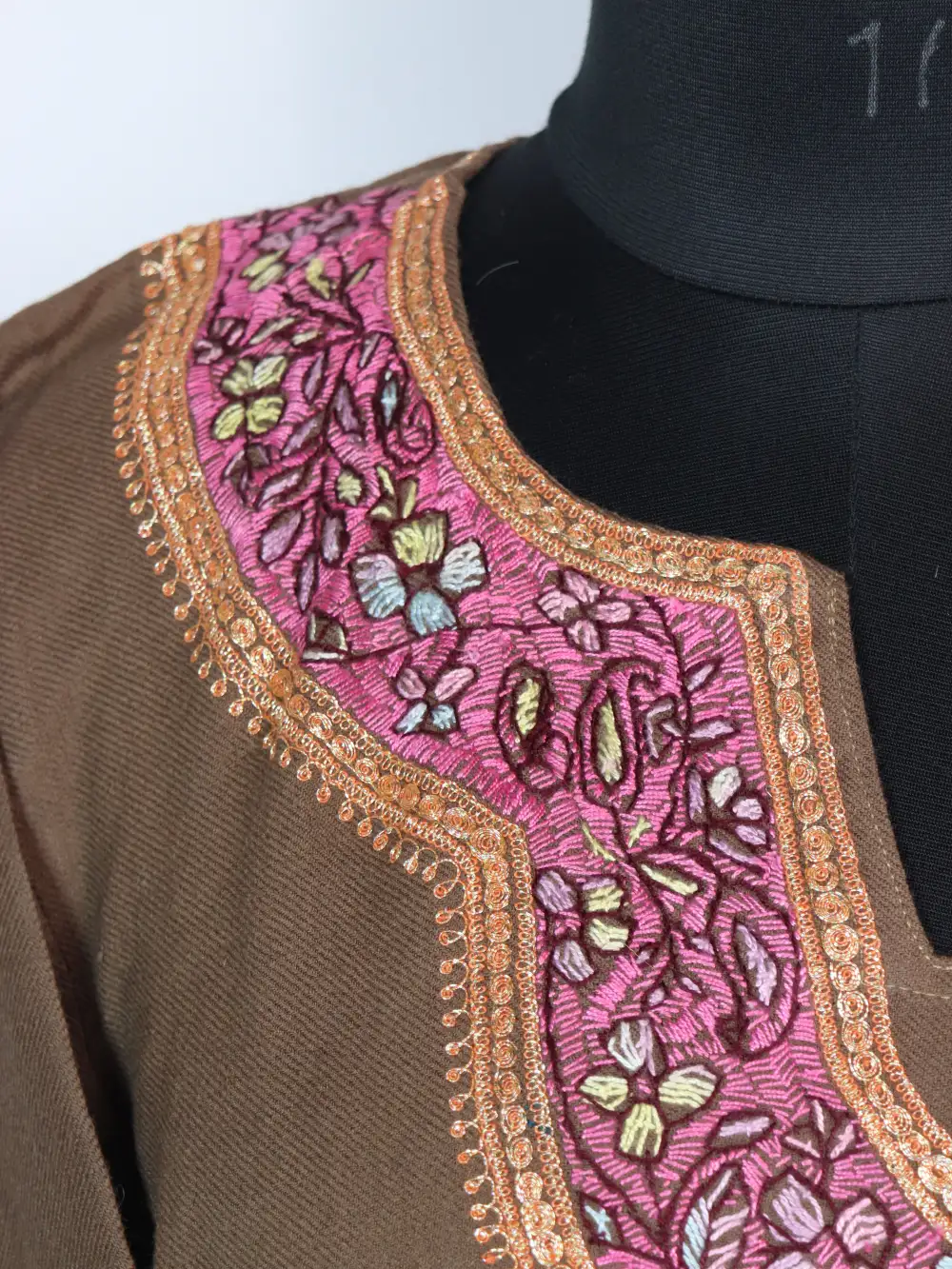 Raffal wool crafts this brown colour kashmiri phiran, it has been detailed with tilla and hand sozni embroidery inserted at neckline and sleeves in tiny badam motifs and it include pockets on both sides make it practical.