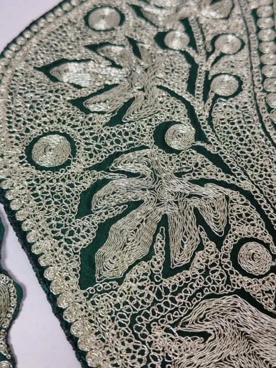 Finished on rich dark green colour, this patche features classic silver tilla embroidery inspired by Kashmiri chinar style. It can upgrade pherans, kurtis, or even shirts effortlessly.