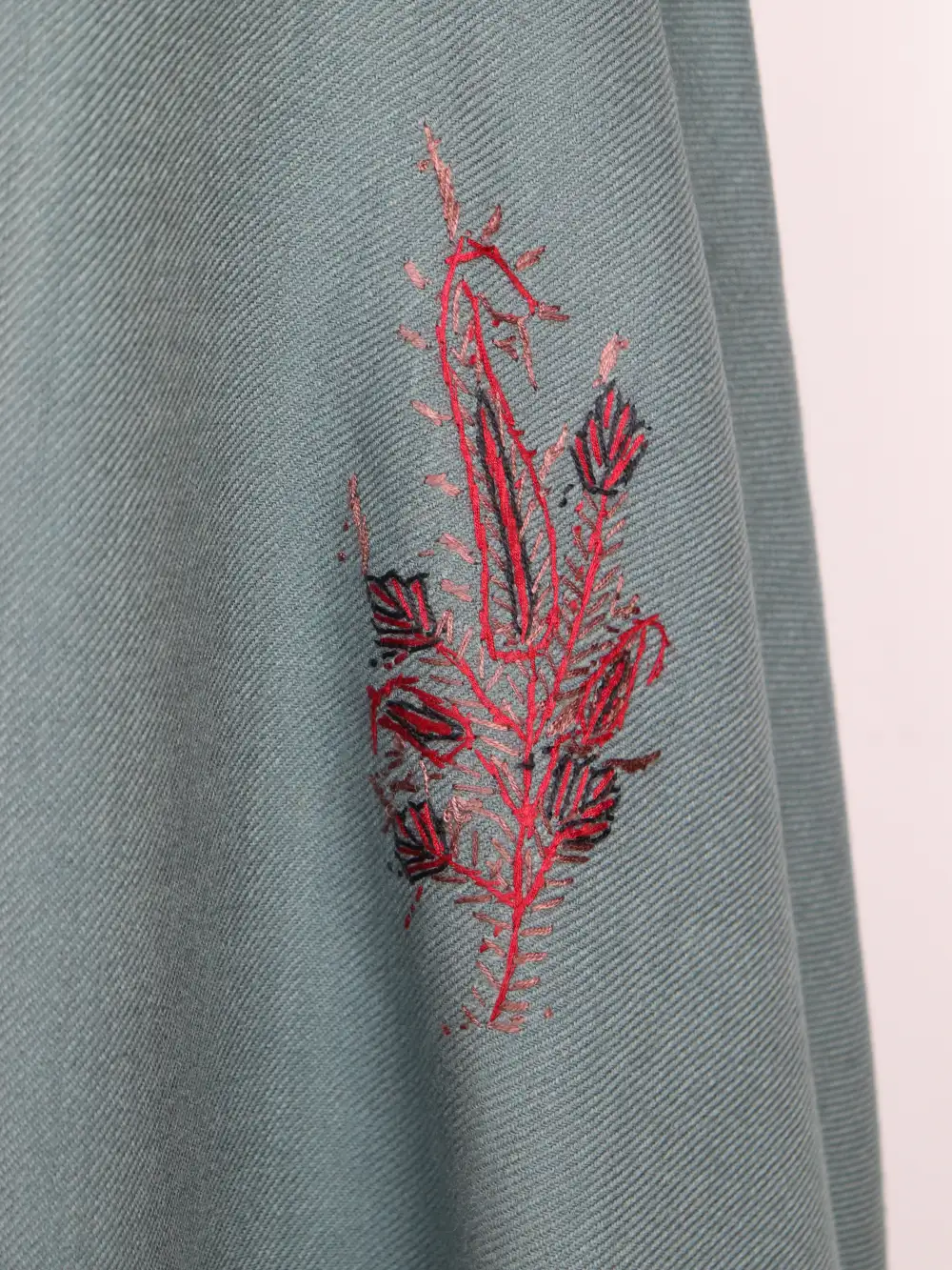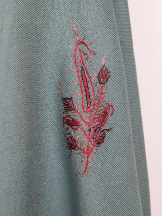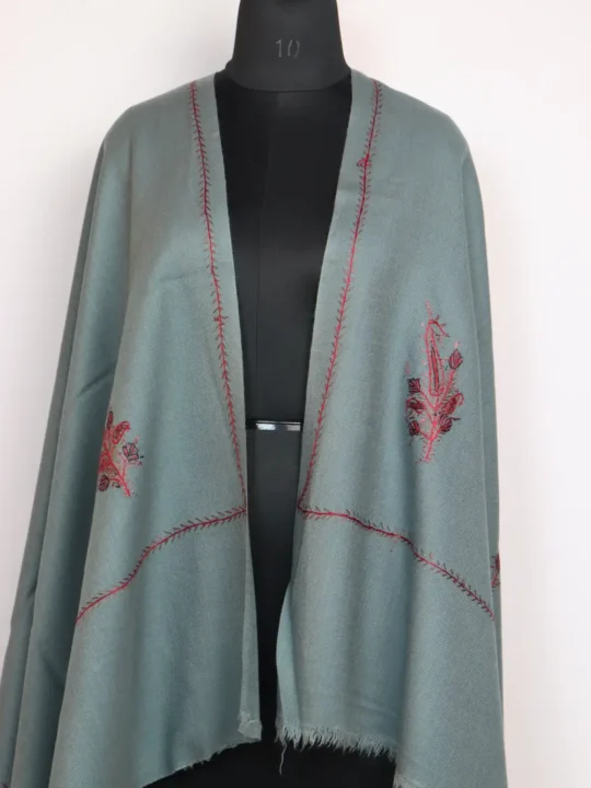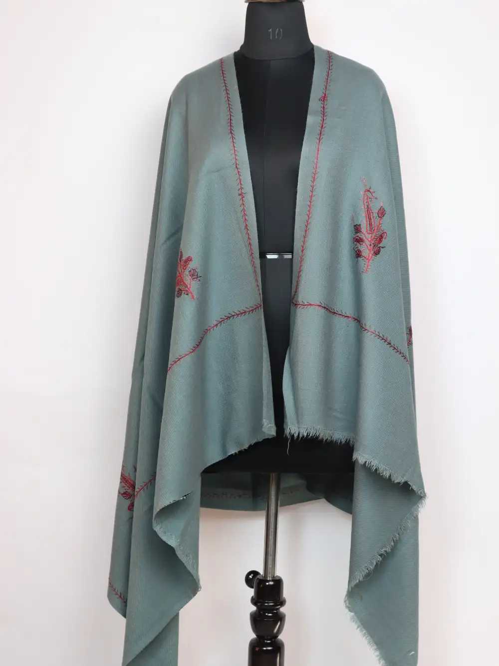 Kashmirin sozni shawl in grey Cashmilon Wool carries continuous border stitching and floral badam corner motifs in fine thread, it has been made for women who value craft. The Kashmirin sozni shawl folds easily into a bag and drapes like a soft statement