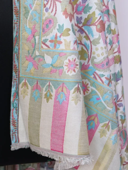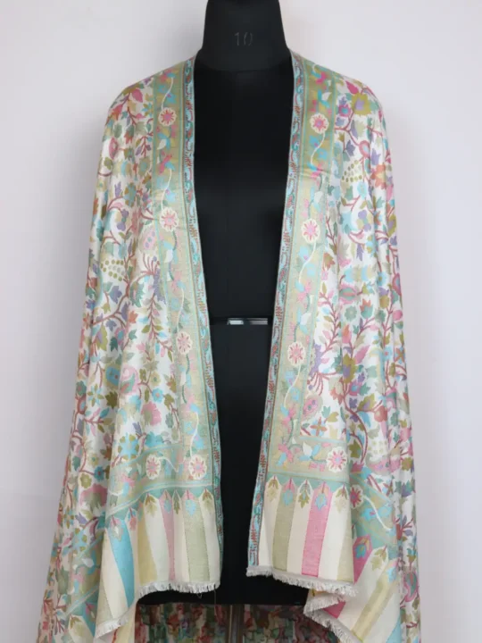 A white silk Kani shawl executed in Kani weaving shows multi-floral design patterns spread all over it and contnuous striped patterns, it has been made for women who value woven detail.