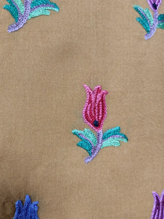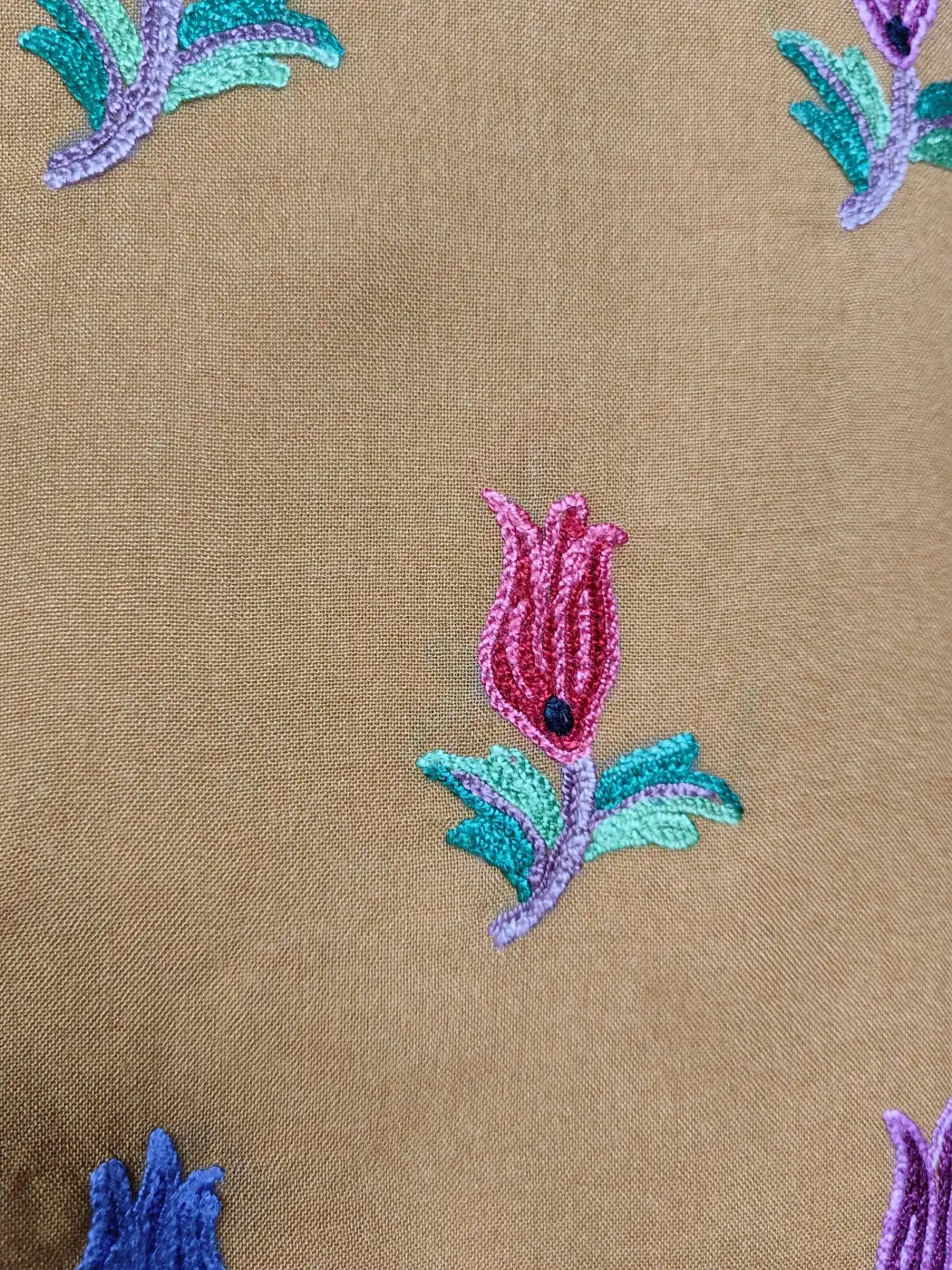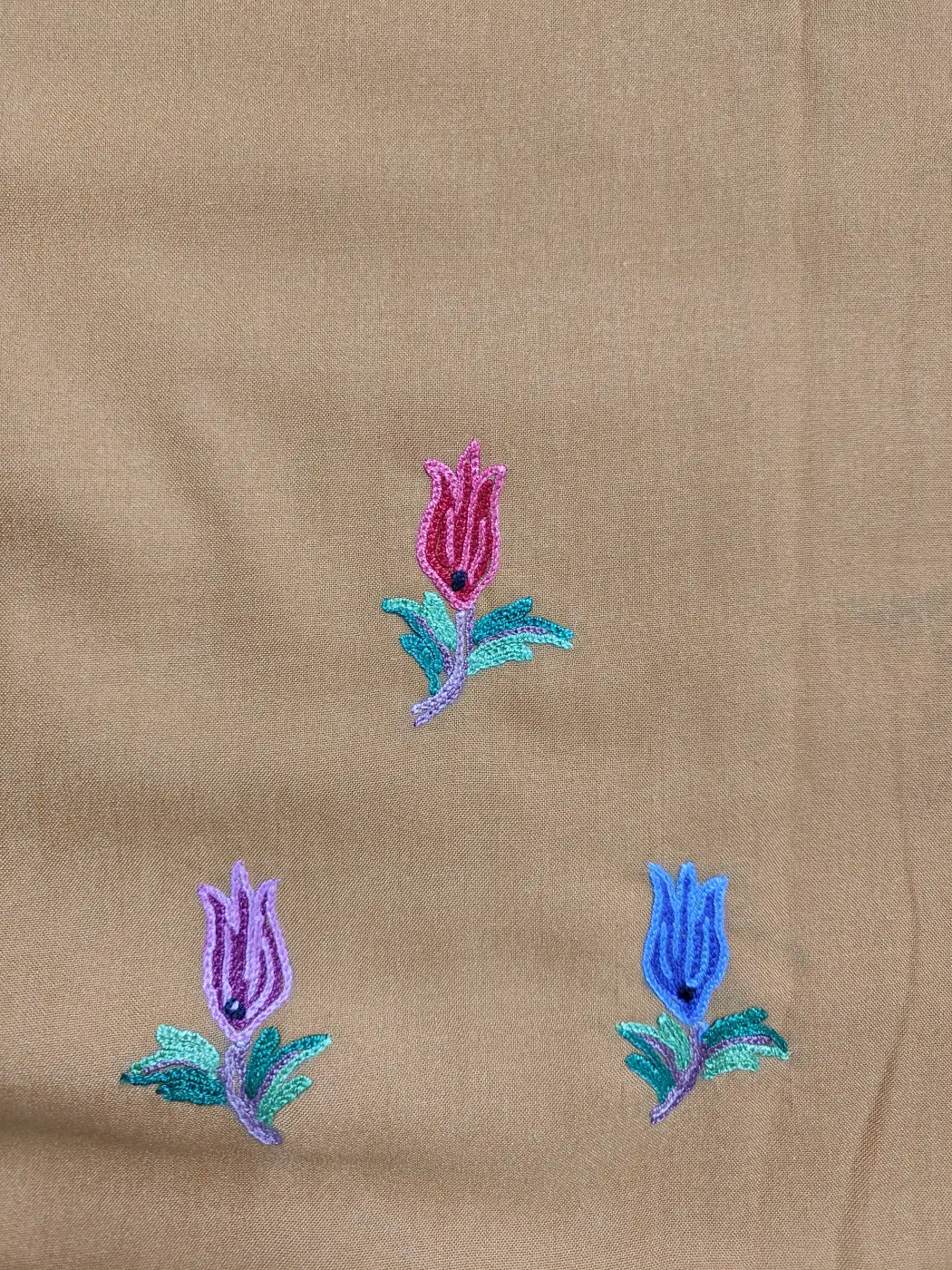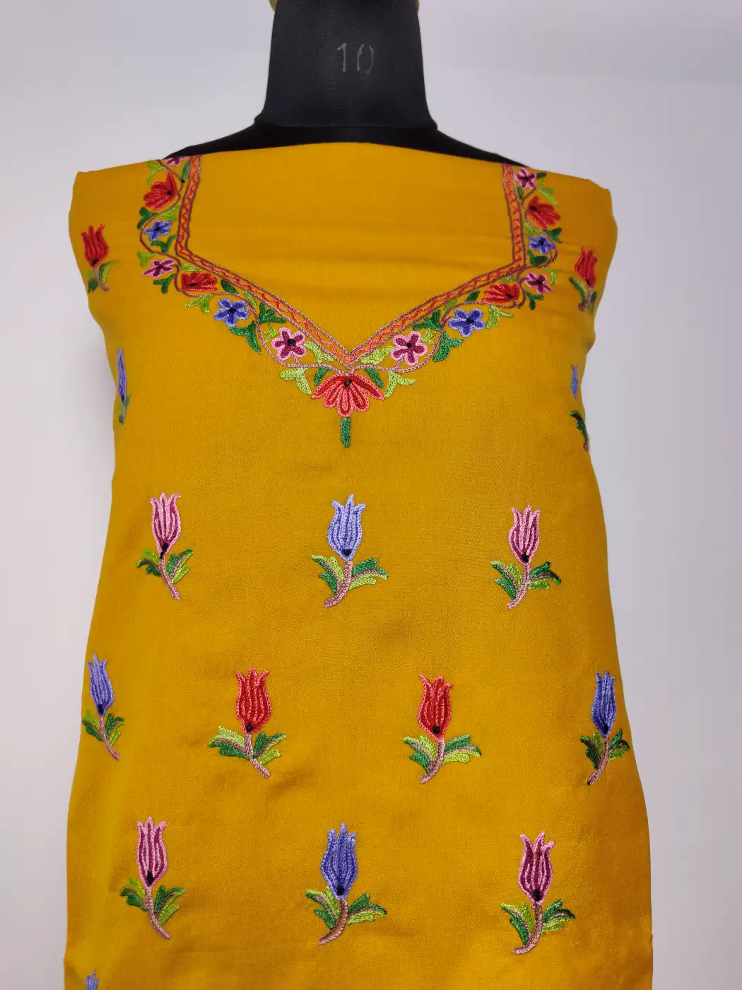 Mustard summer cool cotton fabric defines this suit set. It is adorned with hand aari embroidery. The neckline features floral motifs while the front carries bootis. This Kashmiri suit set comes unstitched for custom stitching.
