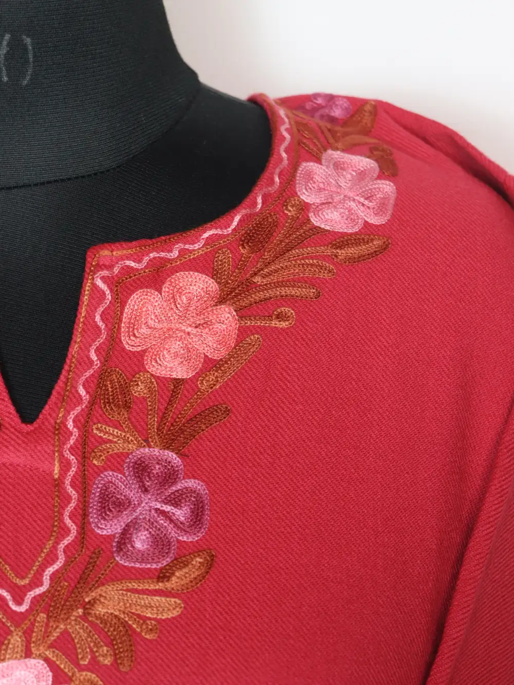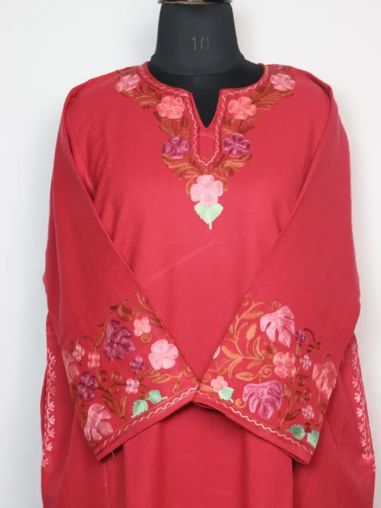 Designed using cashmilon wool for seasonal warmth, this Kashmiri feran appears in pink colour. It includes aari embroidery with floral accents on neckline, sleeves and chinari border.