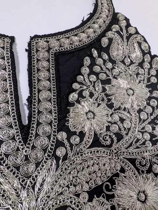 Combining silver tilla embroidery with classic motifs, this patch features continuous chinar designs across the lace. The sleeve patches and neckline carriy a mix of badam and floral patterns, giving the patch a graceful and traditional Kashmiri identity.